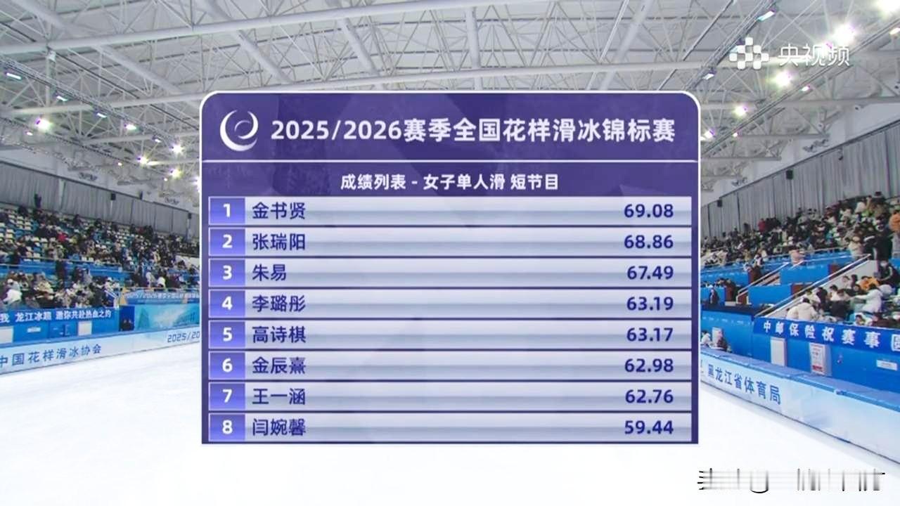 全国花样滑冰锦标赛四个项目中最后结束的女单短节目比赛,与前三项都有一组选手一枝独秀相比,争夺要激烈得多,最终获得前三名的选手之间分数都仅差一点几分,已经拿到两届全锦赛冠军的金书贤暂列第一,但因为她未达到米兰冬奥会参赛年龄,所以冬奥会门票之争将在暂列第二和第三的张瑞阳和朱易之间产生。