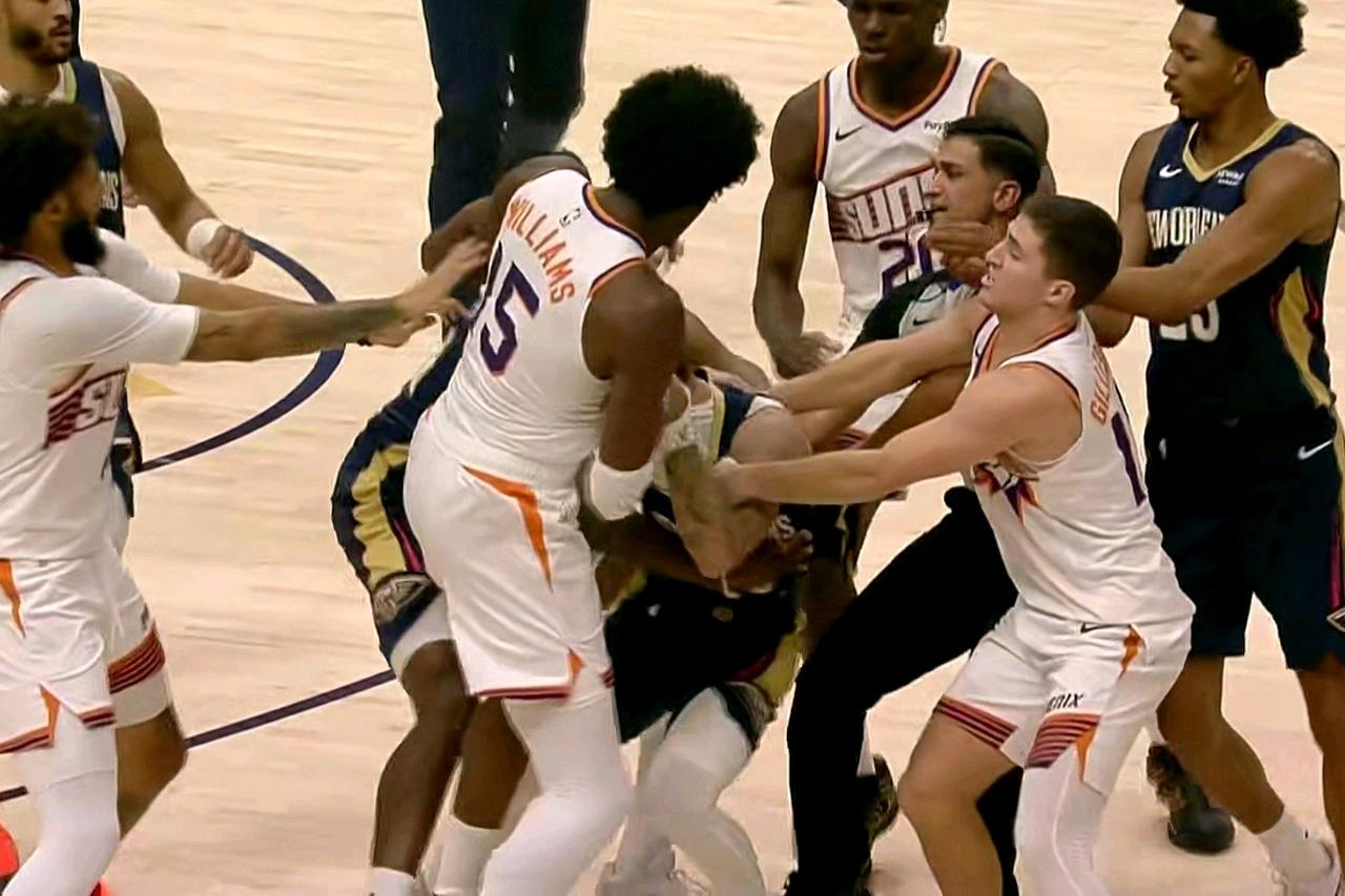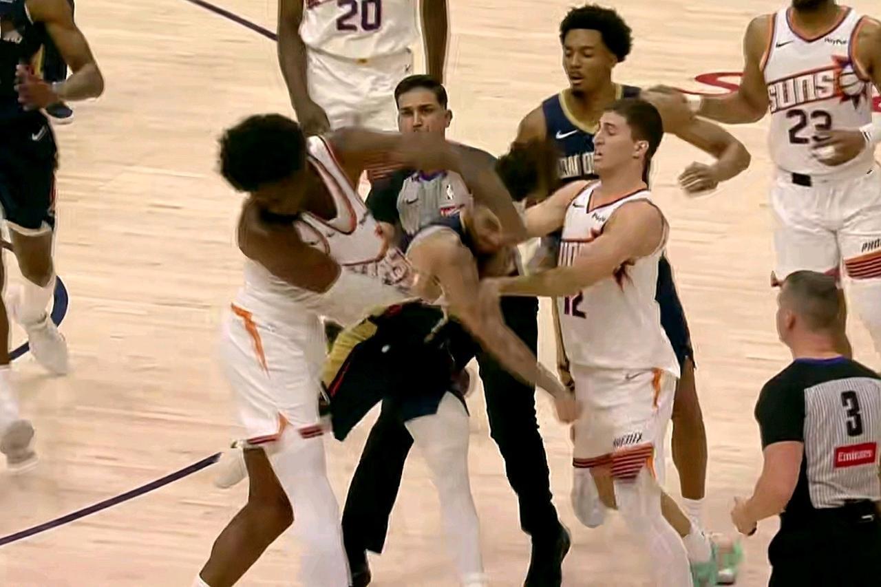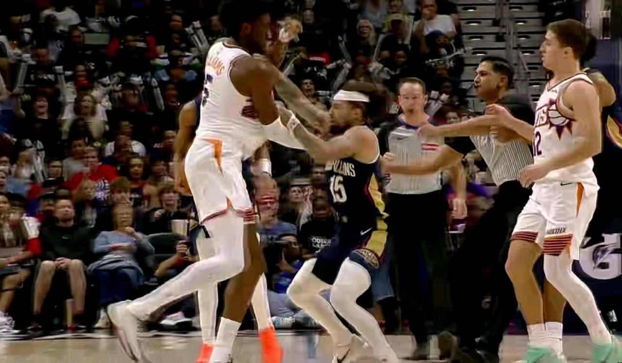 就服老六,这才是真正的互殴! 小小的个子巨大的能量和胆识,在鹈鹕主场迎战太阳的比赛中,发生极其疯狂一幕:阿尔瓦兰多防守马威,先是阿尔瓦兰多轻轻的推搡了马威一把,裁判吹哨了,老六不满意,立即上前和马威理论,谁知道马威才不吃那一套,俩人开始,你一拳,我一拳的互殴起来,老六这小个子一点也不惧马威那高个子,老六的头套都被打掉了,双方球队见状不妙,立即上来制止了,老六也是,不知道是不是面部被打开了,没等裁判看回放升级判罚,立马跑更衣室了,双双驱逐出场,马威也是无奈,被老六强硬一换一了,应该是赚了,也怪不得鹈鹕火气大,刚输给太阳一场,这场又落后,老六这是盘外招啊,不知道鹈鹕能不能顶得住太阳的火力压制! 鹈鹕 鹈鹕互动