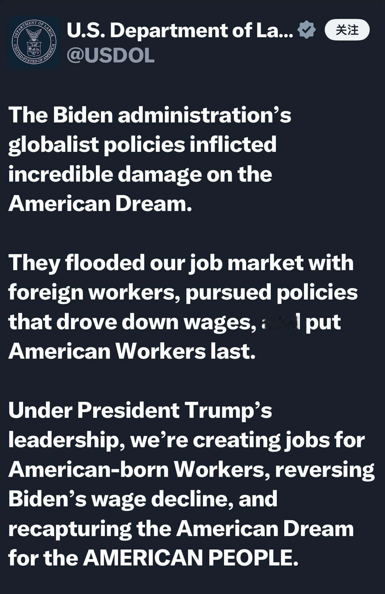 美国劳工部: “拜登政府的全球主义政策对美国梦造成了难以置信的破坏。 他们让外国工人涌入我们的就业市场,推行压低工资的政策,把美国工人的利益放在最后。 在特朗普总统的领导下,我们正在为美国本土工人创造就业机会,扭转拜登时期工资下降的局面,并为美国人民重拾美国梦。”