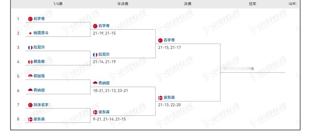 天王杯羽毛球赛今天收官,将举行三四名决赛和冠亚军决赛。 拉尼尔和乔纳坦争夺季军,石宇奇与安东森争夺冠军。 比赛在下午18:30开始。