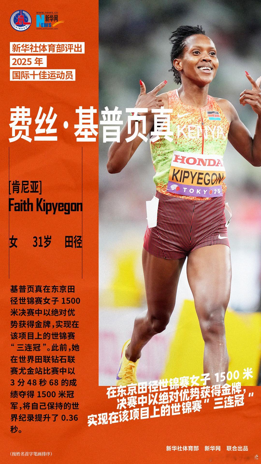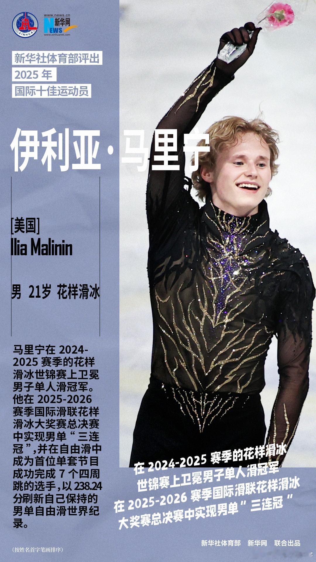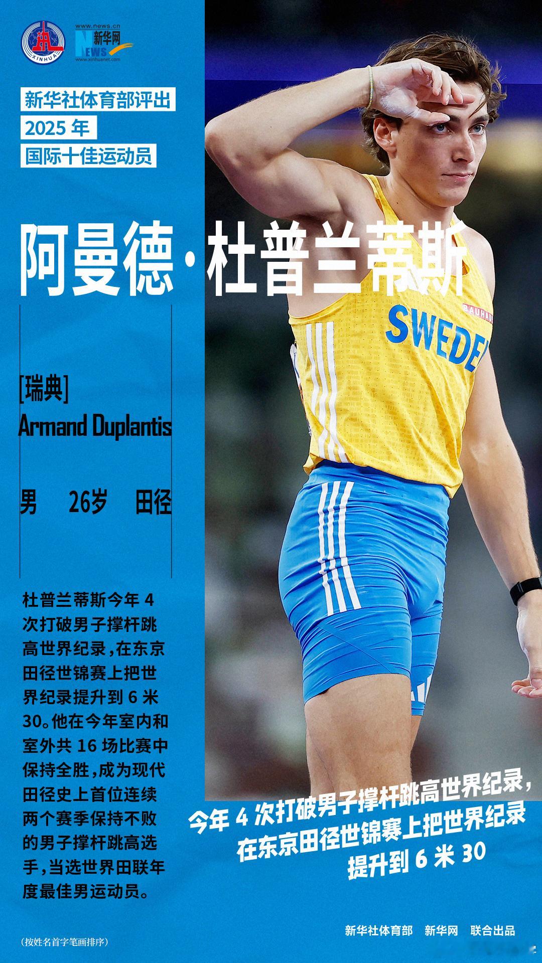 新华社体育部评出2025年国际十佳运动员:兰多·诺里斯(英国,男,26岁,赛车)卡洛斯·阿尔卡拉斯(西班牙,男,22岁,网球)伊利亚·马里宁(美国,男,21岁,花样滑冰)陈芋汐(中国,女,20岁,跳水)阿曼德·杜普兰蒂斯(瑞典,男,26岁,田径)费丝·基普页真(肯尼亚,女,31岁,田径)萨默·麦金托什(加拿大,女,19岁,游泳)塔代伊·波加查(斯洛文尼亚,男,27岁,自行车)谢伊·吉尔杰斯-亚历山大(加拿大,男,27岁,篮球)奥斯曼·登贝莱(法国,男,28岁,足球)体育大赏