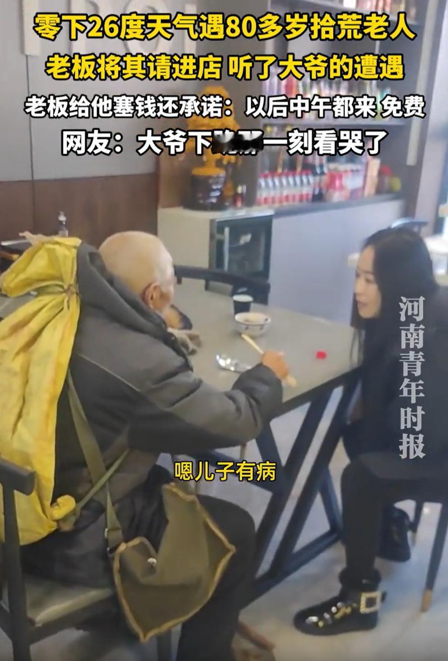 看哭了!黑龙江,老板娘看到零下20多度有一位老人在拾荒,就主动邀请他进屋喝杯热水,而听到老人的遭遇后,直接从前台拿出两百块塞给老人,可让她没想到的是,老人不但不想收,更是直接下跪感谢。网友:你这一跪把我眼泪都下来了 视频中,老人后背背着一个黄色的尼龙袋,聊天中得知,老人今年已经80多岁了,女儿在外地打工,儿子身体有病,看病就花了家里几万块钱 老板娘听到老人的状况,也是心疼不已,说自己也做不了什么,大忙虽然帮不上,但可以每天中午到店里,免费管一顿饭还是没问题的。老人虽然答应下来,但也表示自己不可能天天来 老板娘一看,老人如此这般,还为别人着想,于是又到前台拿了两百块钱准备递给老人,老人见状直接下跪感谢,这一举动,可把一屋子人吓了一跳,这么大的礼,他们也承受不起,连忙扶起老人,而老人嘴里一直念叨着“好人一生平安啊” 这个事传到网上后,也是感动了不少网友 有网友说:老人家跪下那一个瞬间,我一个大男人眼泪一下就止不住了,老板啊,你是好人啊,会有好报的 还有网友说:老板饭店地址在哪?就冲这份善良,她家的饭菜肯定让人放心,祝老板发大财 这事之所以打动这么多人,不只是因为老板娘帮了一把,更因为老人那一跪 那一跪里,有感激,有尊严,也有生活的不易。他不是轻易接受施舍的人,哪怕自己过得很难,也还在为别人着想,怕给人添麻烦。而老板娘的做法也很实在,不是高高在上的同情,而是一杯热水、一顿饭、一点力所能及的帮助 有时候我在想,善良未必是要做多大的事,而是在别人需要的时候,你看见了他,并且没有转过头去。就像这位老板娘,她只是做了一件她觉得该做的小事,却让一个老人,让无数看见这件事的人,都感受到了一种坚定的暖意