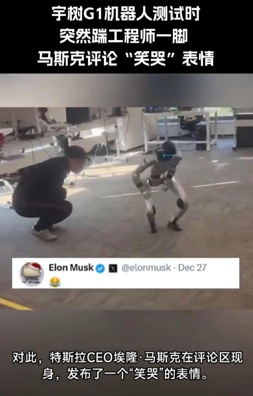 马斯克看到这个还能笑得出来,说明他真的是大心脏。 宇树机器人在测试时不小心踢了一脚测试工程师,工程师痛得蹲下,机器人也模仿了同样的动作。 有一种复刻作案现场的莫名喜感。 马斯克看到这个,发了一个笑哭😂的表情。 马斯克的机器人可没有这么伶俐[偷笑]上次看到他的机器人只能在手上玩模仿弹吉他投篮的动作。 马斯克要加油了。 机器人落后,电动车也落后,现在就筷子🥢夹火箭🚀还领先,但是似乎我们在走另外一条赛道,人间大炮直接轰上天去,对火箭的重复使用兴趣没那么大哦。 点右上角关注我,我们一起去看这个魔幻的世界