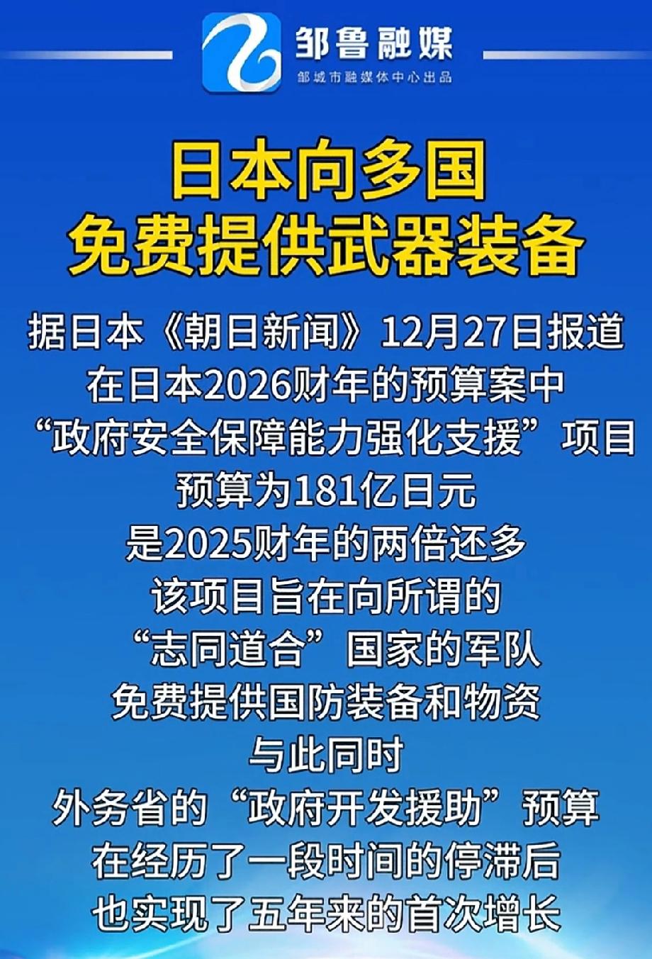 日本将向12国免费提供武器装备 日本这波向12国免费提供武器装备的操作,实在是耐人寻味。日本作为二战战败国,本应安分守己,可如今却在军武方面动作不断。 从历史角度看,日本曾有过对外侵略的黑历史,这一行为很难不让人警惕。免费送武器,是想扩大自己在国际上的军事影响力,还是另有不可告人的目的?这些武器一旦流入他国,是否会引发地区局势的不稳定?比如在一些地缘政治敏感地区,可能会打破原有的军事平衡。日本这一步棋,就像在平静的湖面投下一颗石子,后续的涟漪值得我们密切关注。