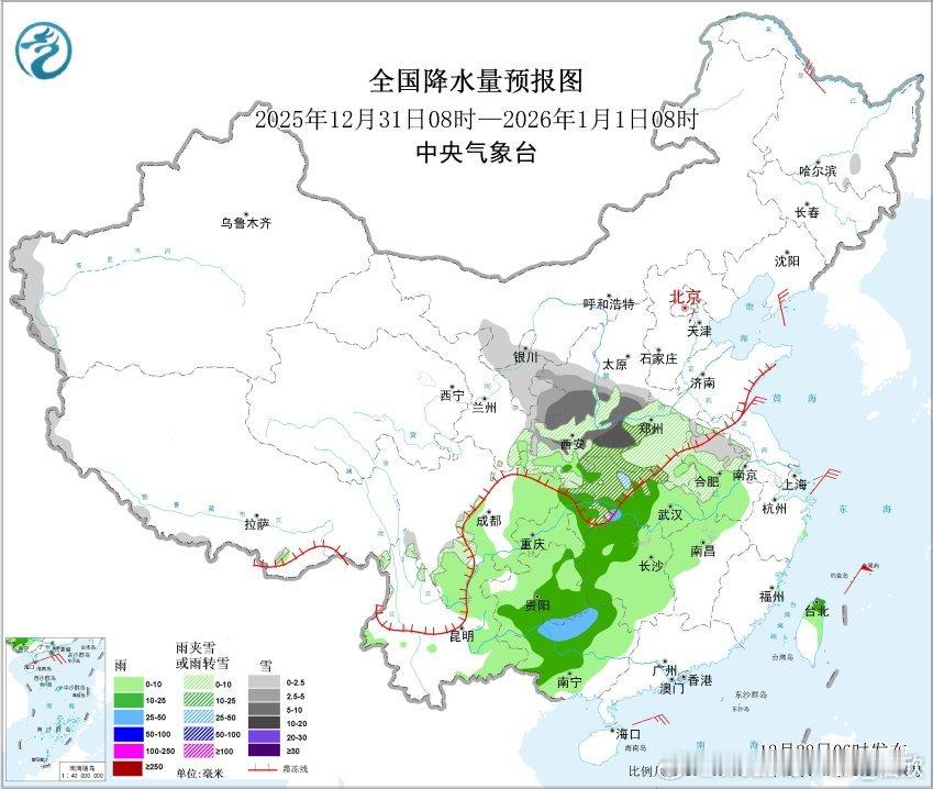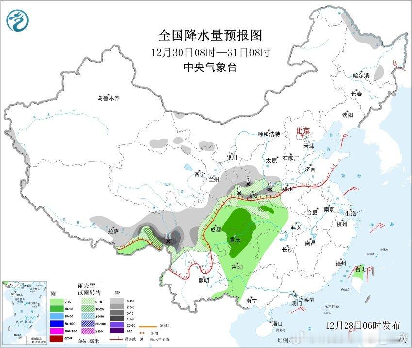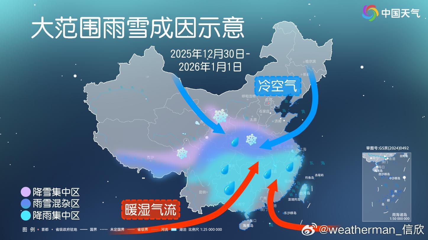 【降水】近期降水稀少的局面在今明两天持续。不过在12月30日到明年1月1日,我国将出现一轮跨年度的雨雪过程。西藏东部、西北地区东部、华北南部、内蒙古东部、东北地区、黄淮西部、江汉西部等地部分地区有小到中雪或雨夹雪,局地大雪;西南地区东部、江淮、江南、华南等地有小到中雨,局地大雨。对应形势场,南支槽发展,槽前偏南暖湿气流北上。北方有冷空气南下,而且部分冷空气经过东部海区加湿回流进入内陆。在冷暖空气交汇下,出现大范围降水。在陕西南部、湖北西部和北部、河南、安徽中北部可能出现雨雪转换,如果降温速度快,降雪出现时间早,降雪占比高,降雪量有可能达到大雪甚至暴雪。反之降温缓慢,后期水汽供应不足,降雪就会弱于预期。从1月2日以后,冷空气占据主动,暖湿气流败退。降水又会明显缩减。总体来看,未来降水从30日开始发展,31日白天到1日晨,雨雪范围最广,强度最强。1日白天开始,雨雪缩减。
