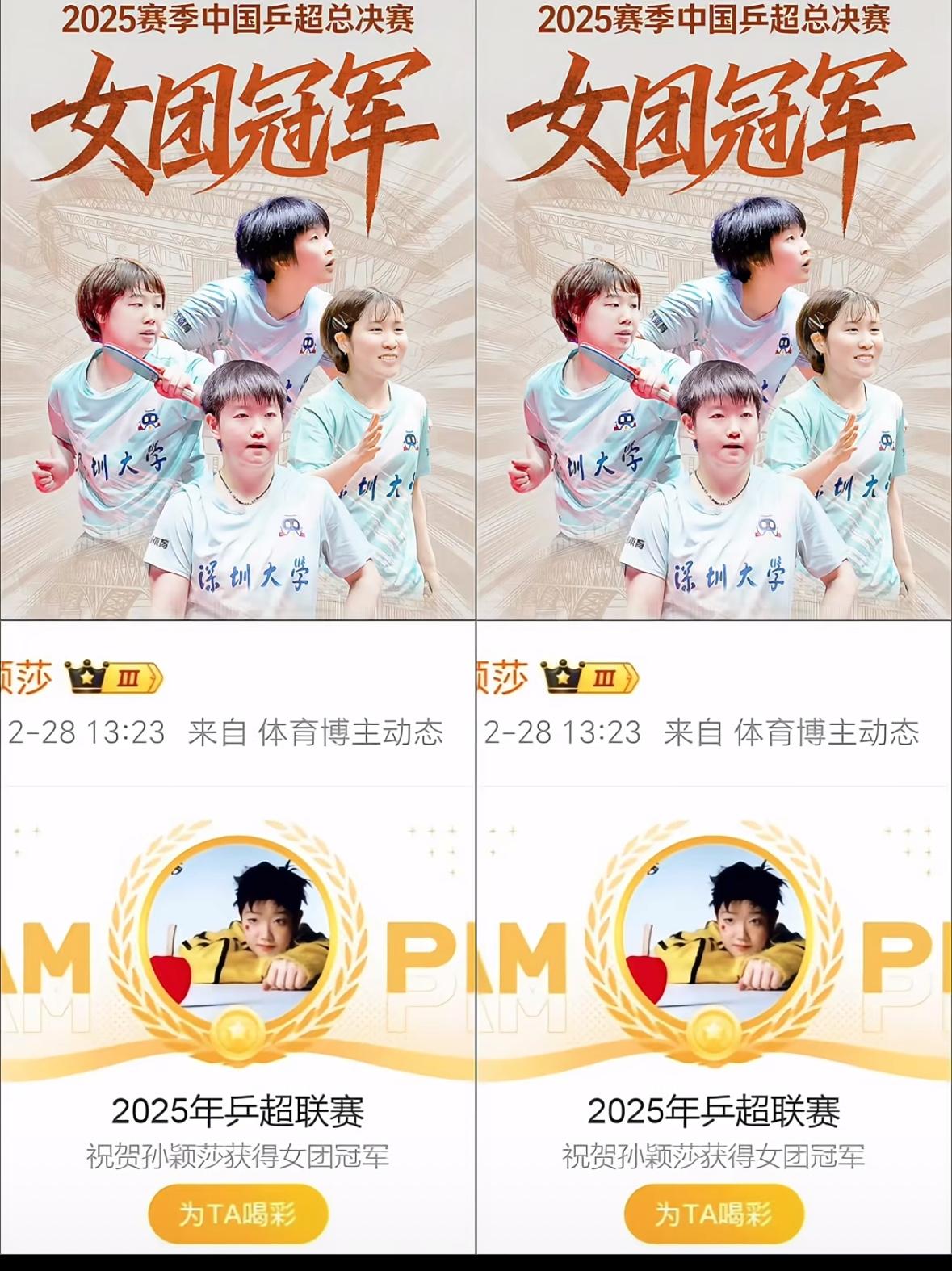 孙颖莎恭喜深圳大学代表团夺冠——孙颖莎的拼搏精神带到了赛场 孙颖莎在第一时间祝贺深圳大学 代表团夺得2025赛季团体冠军🏆, 深圳大学不负众望夺冠了, 蒯曼,覃予宣,平野美宇 的表现非常精彩, 希望深圳大学继续保持良好势头, 明年我们一起继续努力💪…… 孙颖莎的拼搏精神带给深圳大学 宝贵的精神财富, 莎莎这个灵动的精灵带起来 一群灵动的小可爱😍, 今天的一单覃予宣太支棱了, 孙颖莎加油的力量传到了赛场, 看到颁奖典礼, 非常高兴深圳队的胜利, 遗憾的是莎莎没有在场…… 祝贺深圳大学2026年一切顺利!