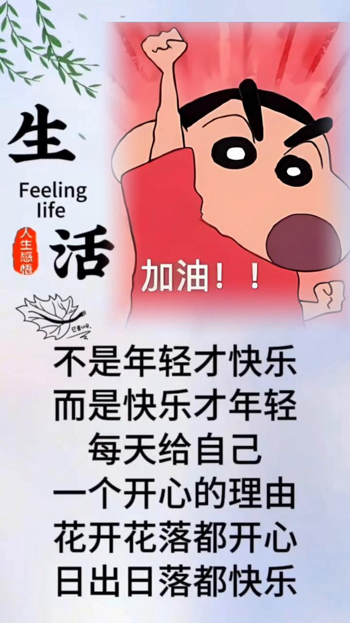 人生感悟。 加油!不是年轻才快乐,而是快乐才年轻。每天给自己一个开心的理由,花开花落都开心,日出日落都快乐。