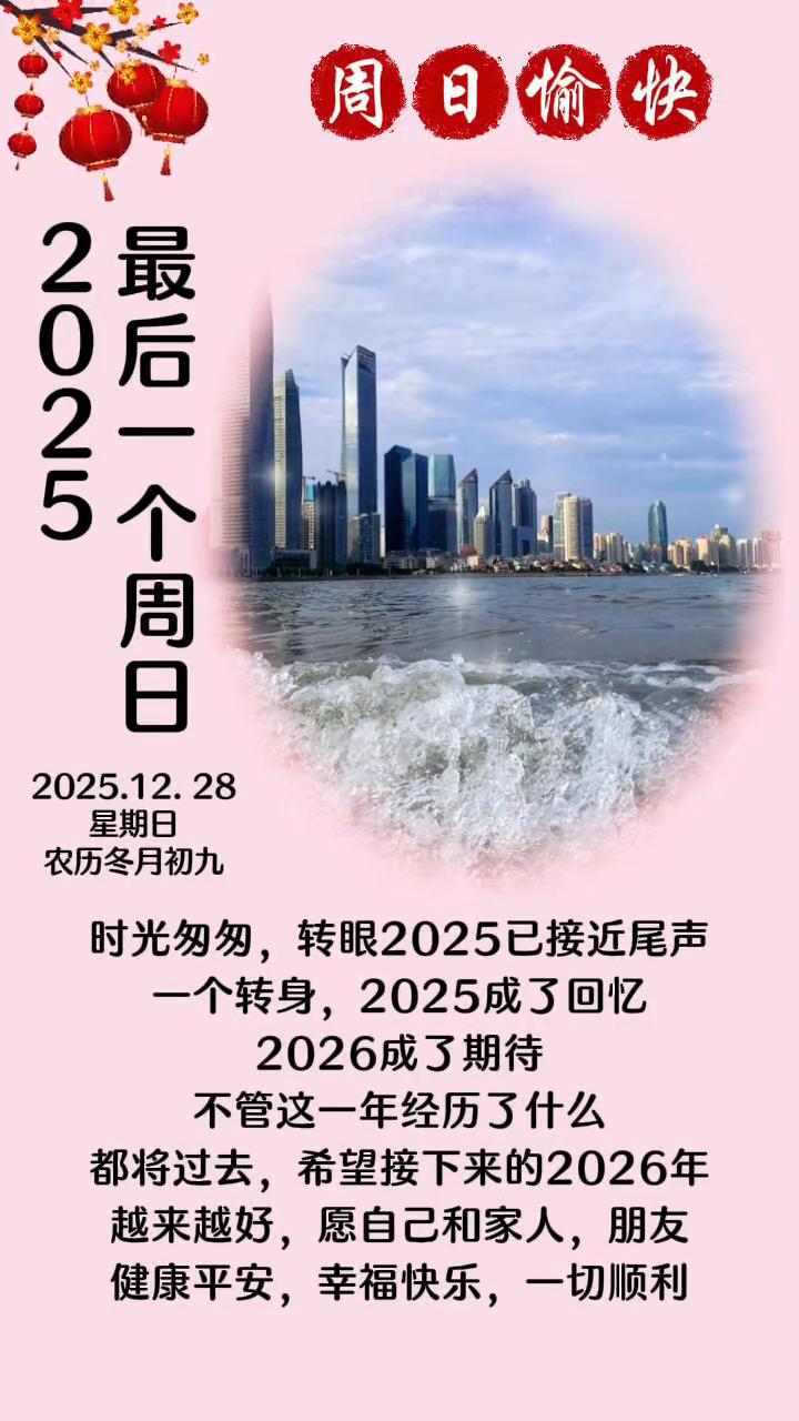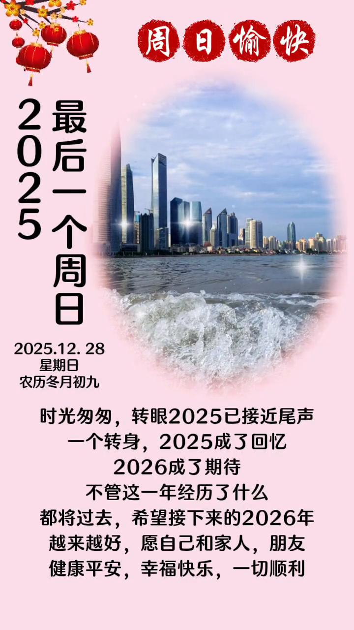 周日愉快。 最后一个周日,2025.12.28,星期日,农历冬月初九。时光匆匆,转眼2025已接近尾声。一个转身,2025成了回忆,2026成了期待。不管这一年经历了什么,都将过去,希望接下来的2026年越来越好,愿自己和家人、朋友健康平安、幸福快乐、一切顺利。