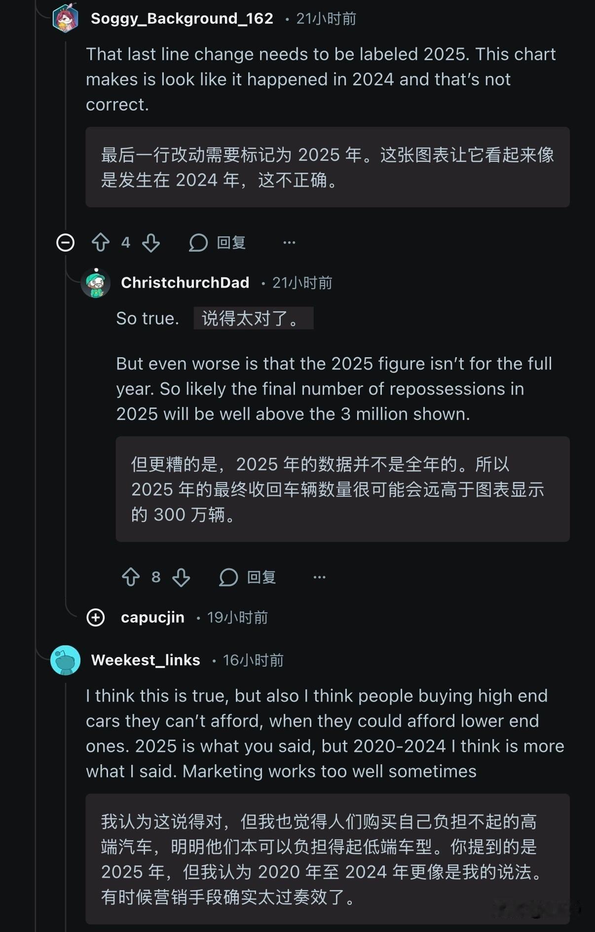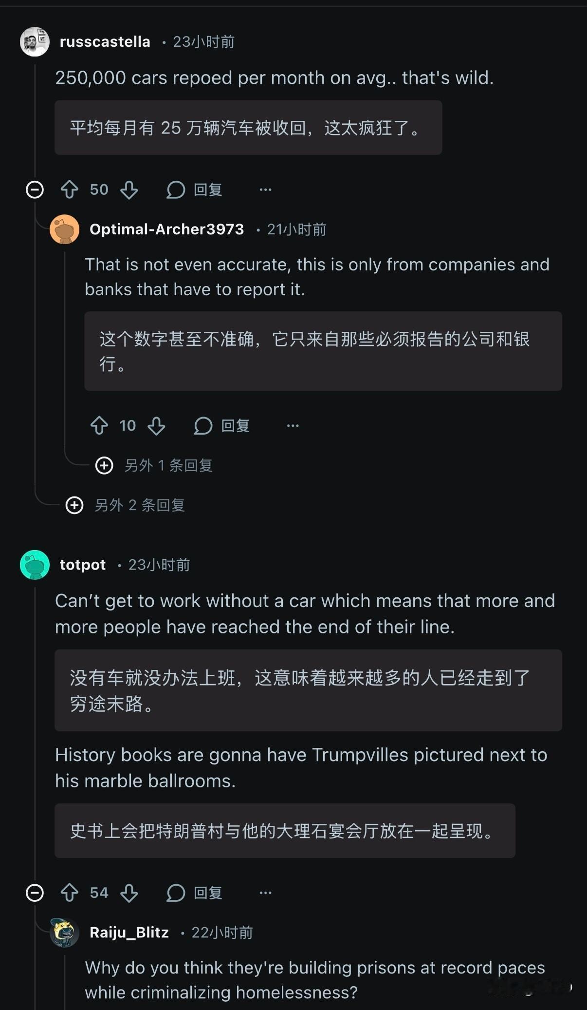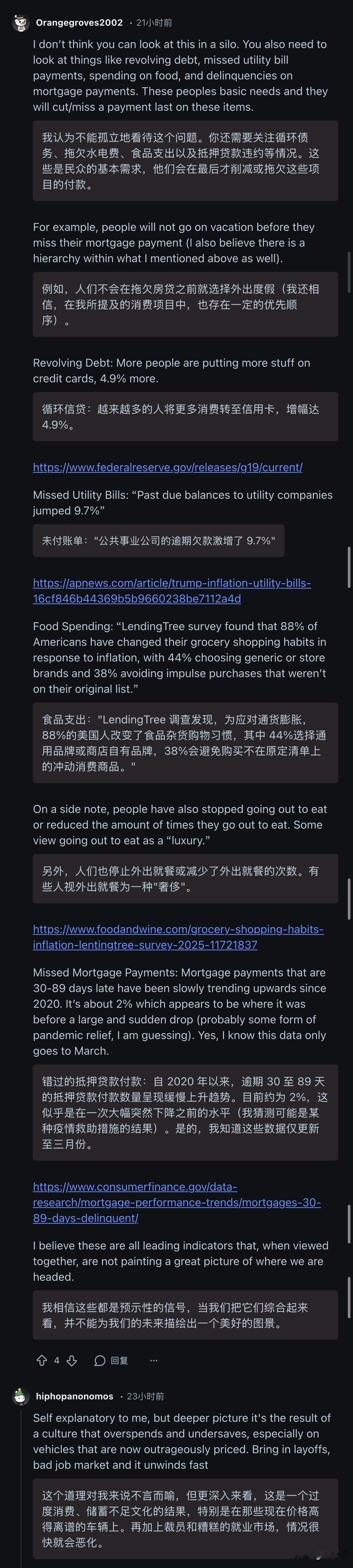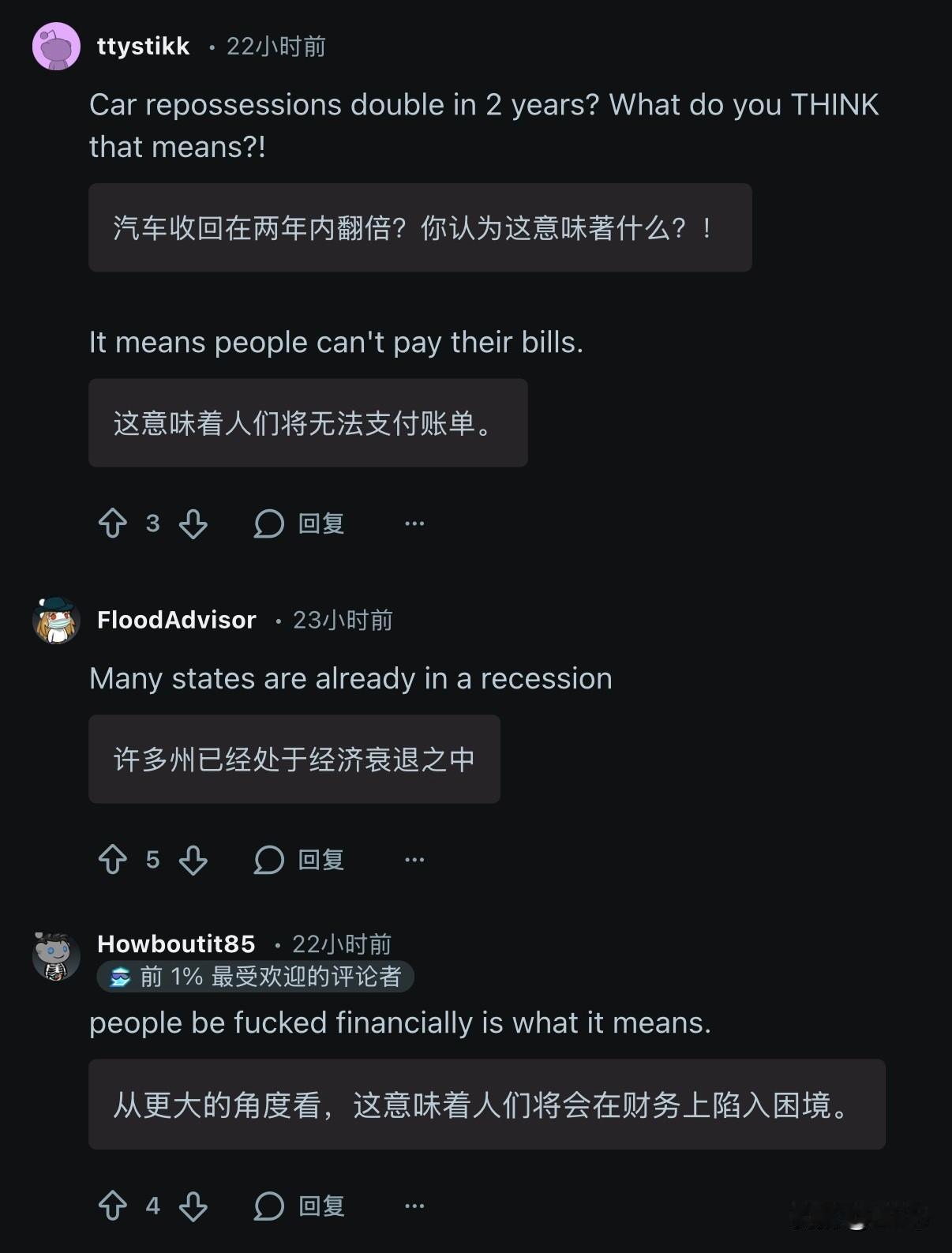 美国人分享鬼故事:2025年还没有结束,美国因断供而被收回的汽车数量,已经激增到08年金融危机的两倍。平均每月有 25 万辆汽车被收回,这个数字甚至不准确,它只来自那些必须报告的公司和银行。对于一个生活在车轮上的国家来说,这意味着什么?美国网民已经自己给出了回答:“Can’t get to work without a car which means that more and more people have reached the end of their line(没有车就没办法上班,这意味着越来越多的人已经走到了穷途末路)”这是美国人自己的讨论,在其中并未发现高华的身影。可能是这些美国人不带高华玩吧?