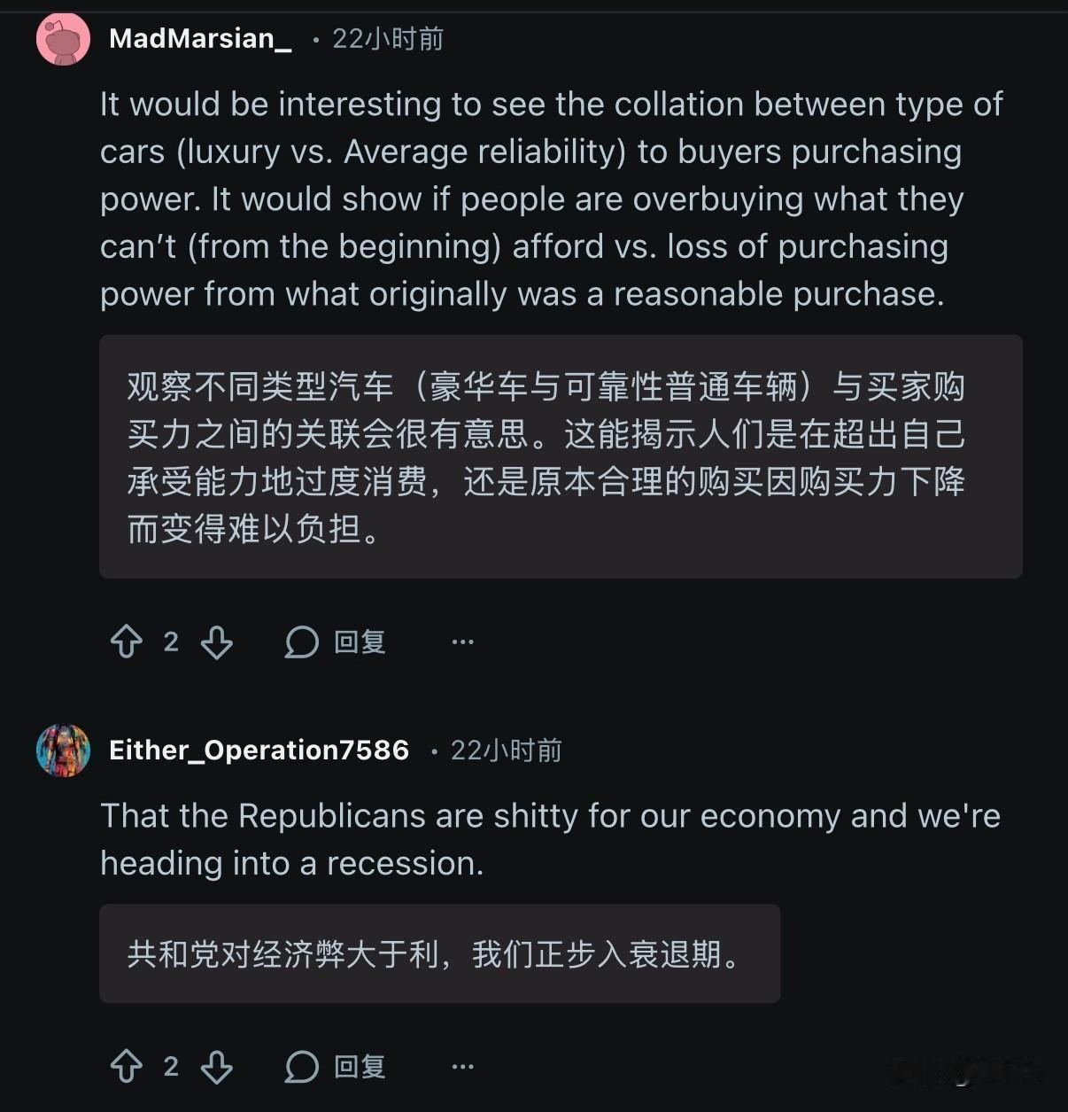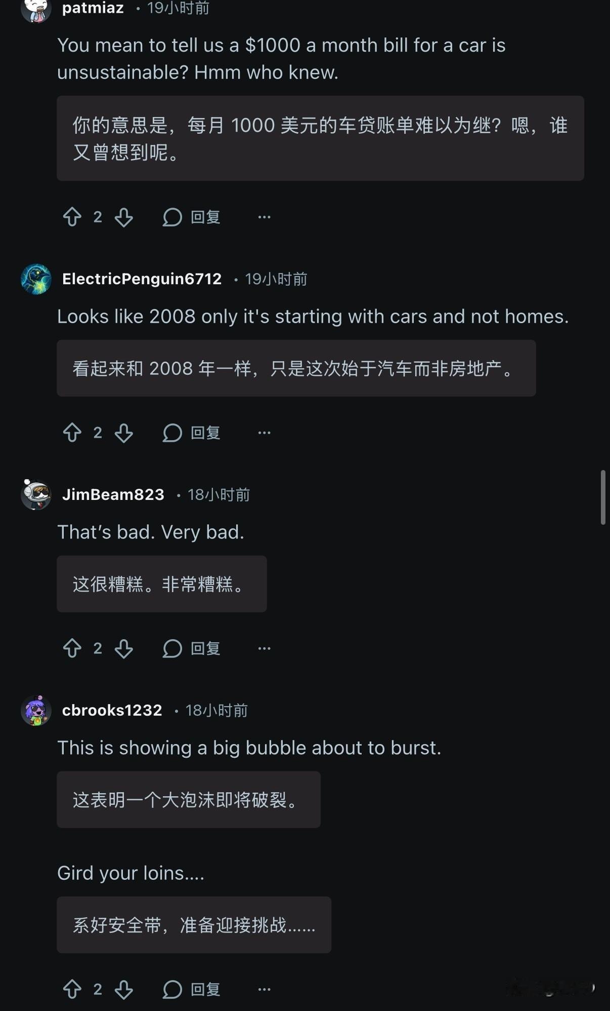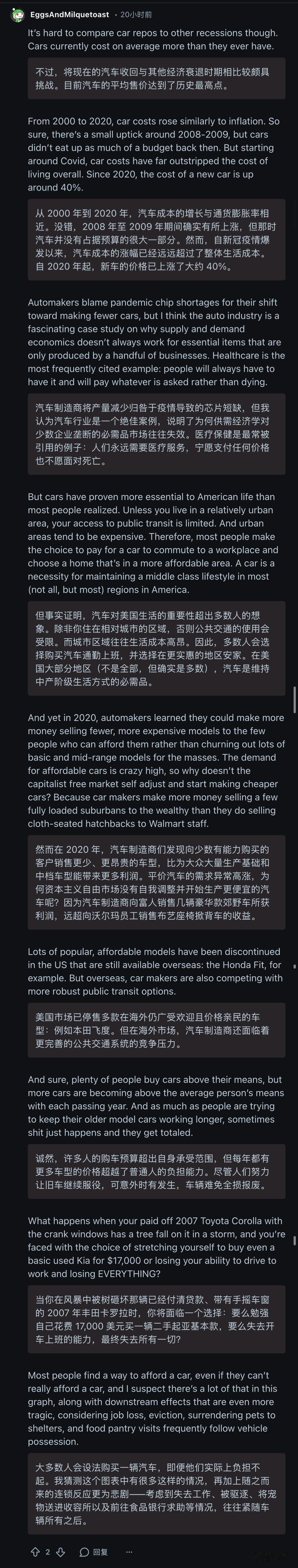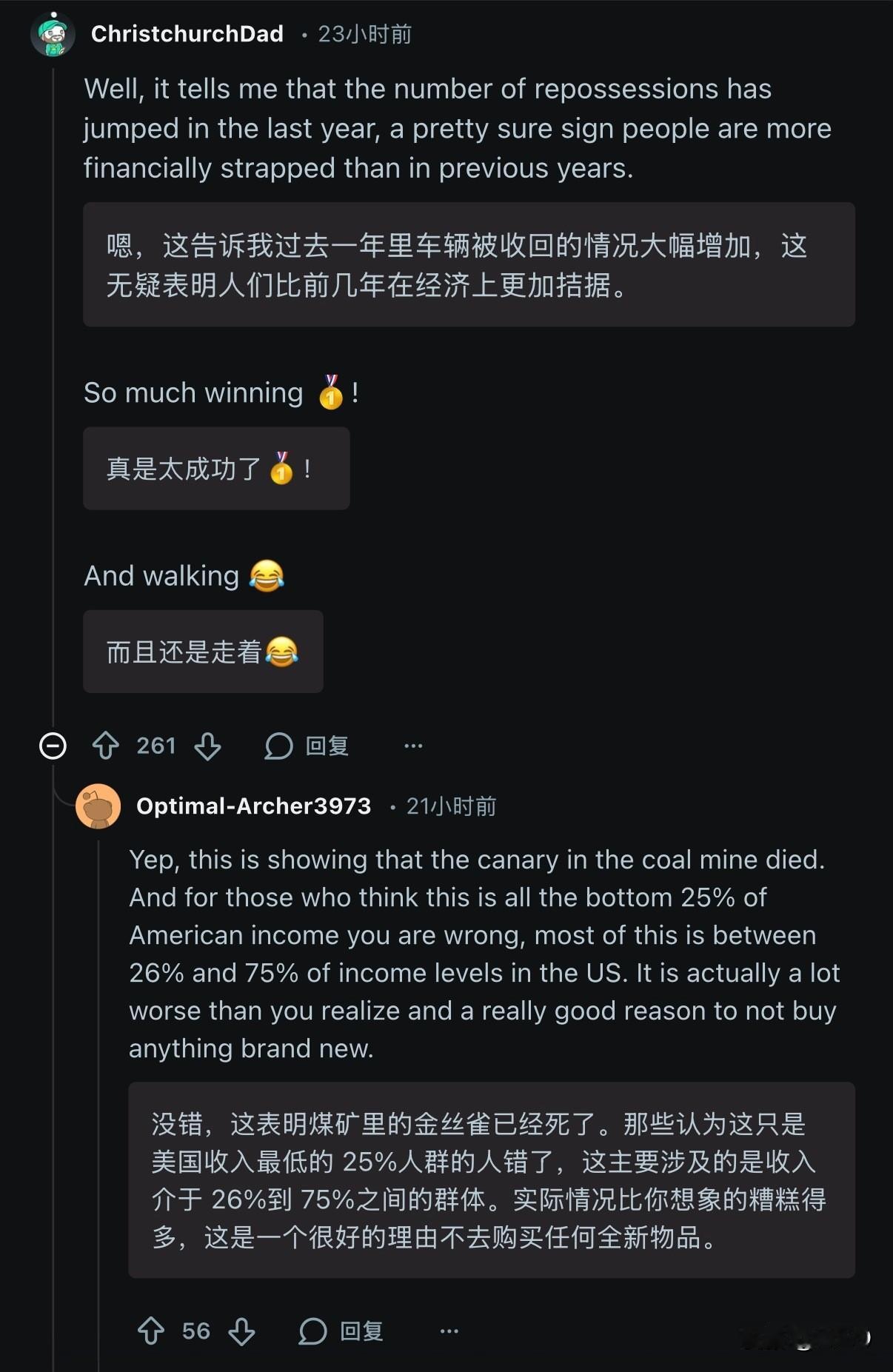 美国人分享鬼故事:2025年还没有结束,美国因断供而被收回的汽车数量,已经激增到08年金融危机的两倍。平均每月有 25 万辆汽车被收回,这个数字甚至不准确,它只来自那些必须报告的公司和银行。对于一个生活在车轮上的国家来说,这意味着什么?美国网民已经自己给出了回答:“Can’t get to work without a car which means that more and more people have reached the end of their line(没有车就没办法上班,这意味着越来越多的人已经走到了穷途末路)”这是美国人自己的讨论,在其中并未发现高华的身影。可能是这些美国人不带高华玩吧?