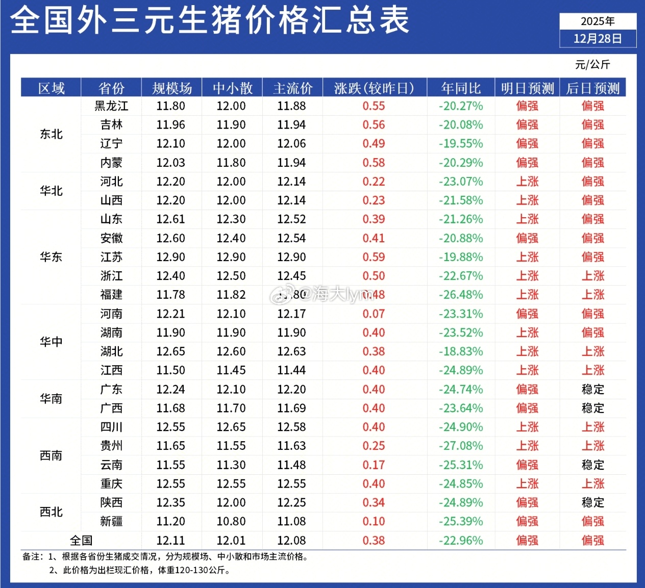 周末多地猪肉价格累计上涨5~6毛/公斤12月28日全国外三元生猪出栏均价为12.08元/公斤,较昨日上调0.38元/公斤,最低价新疆11.08元/公斤,最高价江苏12.90元/公斤(附图来源:Mysteel)生猪