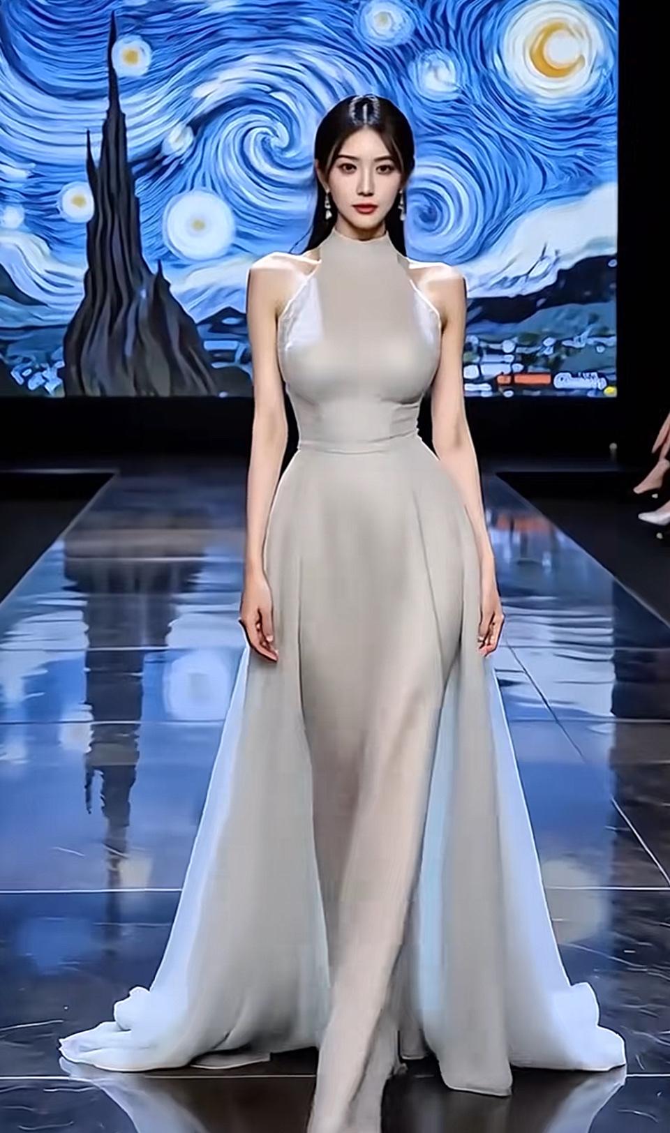 秀场之上,浅杏色礼裙勾勒出优雅轮廓,身后是梵高的星空浪漫,温柔与艺术撞个满怀。 2. 当极简的高定礼裙遇上梵高的《星月夜》,冷艳的秀场瞬间揉进了艺术的温柔笔触。