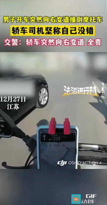 “恶人先告状!”江苏,一名轿车司机在道路上突然向右变道,撞倒正常行驶的摩托车,面对摩托车驾驶员的质问和交警的定责,司机竟然仍坚称自己没错! 来源:【法治进行时】 据当时的视频显示,摩托车驾驶员在道路上靠右正常直行,而他旁边一名轿车司机最开始也是直行,到前面一路口时,轿车司机应该是要右转进辅路了,但他并没观察右边车辆,突然从中间车道向右变道,未做任何预警,直接撞倒了右侧正常行驶的摩托车! 事故发生后,被撞的摩托车上的外卖员立即与轿车司机理论。外卖员质问道:“你这是直行道吗?你怎么走的?你别逃!”但轿车司机态度强硬,拒绝承认自己的错误! 面对双方争执不下的局面,事故最终交由交警处理。交警调取了行车记录仪录像,仔细查看了事故发生的全过程! 根据记录,轿车司机在未确保安全的情况下突然变道,直接影响了正常行驶的摩托车,导致事故发生! 然而,即使面对行车记录仪的铁证,轿车司机仍然坚称自己没有错。这种态度与交警的专业判断形成了鲜明对比! 交警明确表示:“从中间车道突然向右,全责!”这一判断基于《中华人民共和国道路交通安全法实施条例》第四十四条,规定变更车道的机动车不得影响相关车道内行驶的机动车的正常行驶! 最终,轿车司机因违反“变更车道不得影响相关车道内车辆正常行驶”的规定承担全责,同时被处200元罚款! 为避免类似事故发生,交警部门总结出 “一灯、二镜、三方向”的安全变道准则! “一灯”指变道前必须提前3秒以上打转向灯,向其他车辆示意;“二镜”是观察后视镜及车辆两侧盲区,确保周围情况安全;“三方向”则是缓打方向盘,迅速完成变道,保持匀速或稍稍加速,避免减速变道! 此外,驾驶员还需注意每次只能变更一条车道,不可实线变道,不可一次变更多条车道!