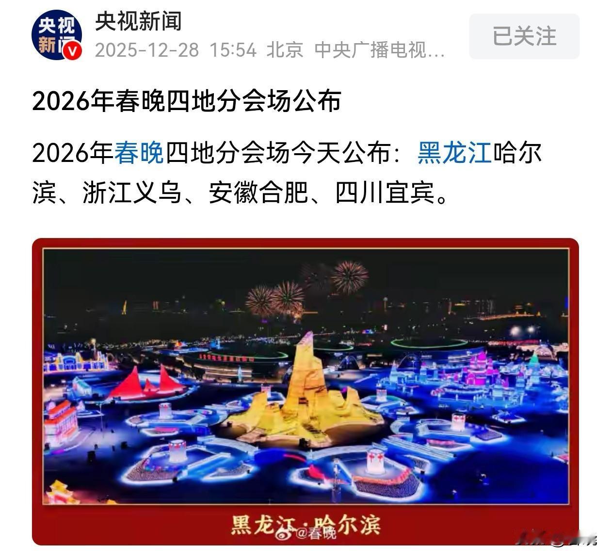 恭喜[星星眼]哈尔滨成为2026年央视春晚分会场。 2026年春晚分会场设在四地