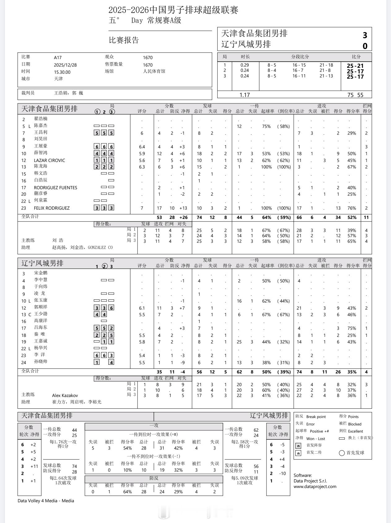 【技术统计】排超联赛第5轮,天津男排3比0辽宁男排(25-21 25-17 25-17)排超联赛2025-2026中国排球超级联赛