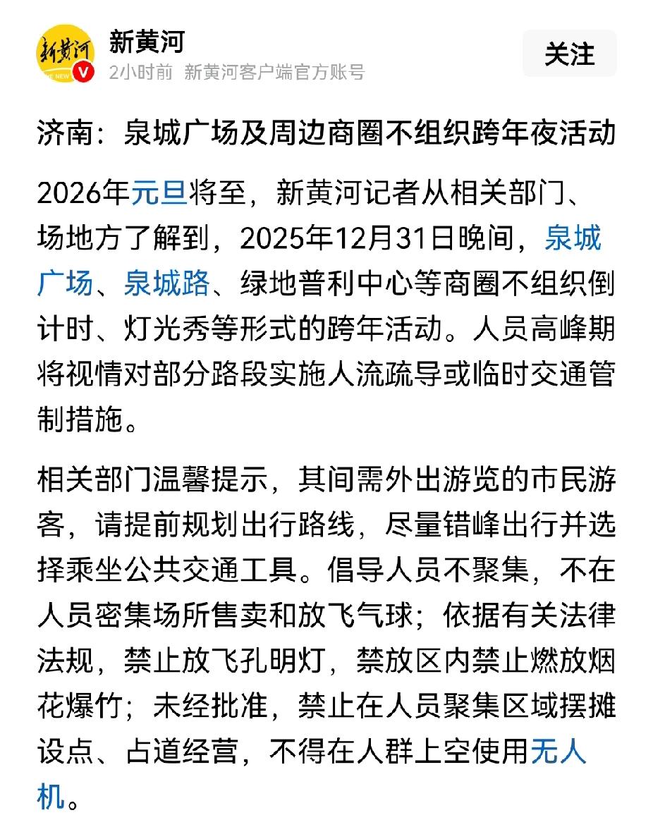 大家注意,今年泉城广场及其周边商圈不组织跨年夜活动了,要是没有特别情况不用等到半