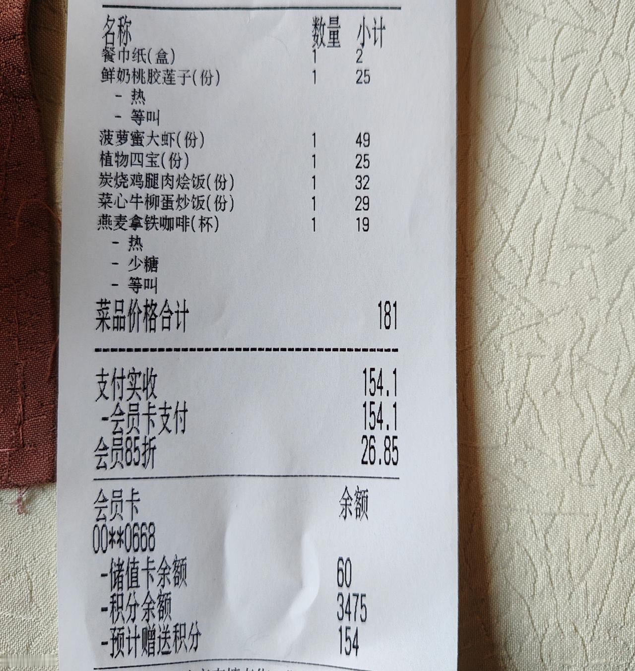 下午在宁波南塘老街就餐,这家餐厅使用会员卡打了85折。个人感觉整体的菜价,性价比还是挺高的。不知道大家怎么看! 181元的餐费,优惠了26.85元。一份甜品,一份大虾,一份炒蔬菜,一份鸡腿肉烩饭,一份菜心牛柳蛋炒饭,一份燕麦拿铁咖啡,总共154.1元。这个价格,在旅游型的商业街区,其实还算实惠的。