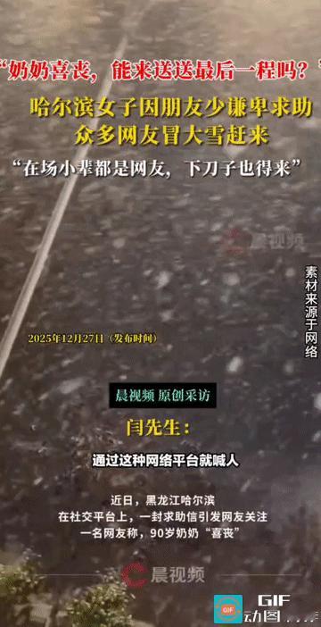 “看哭了!”黑龙江哈尔滨,一名女子因90岁奶奶“喜丧”,却朋友不多且多在外地,担忧葬礼冷清的她,在社交平台发帖求助网友能否来送奶奶最后一程。令人感动的是,帖子发出后,周边的网友全都冒着罕见大雪,从四面八方赶来赴约! 来源:【潇湘晨报·晨视频】 社交平台上那条求助信息发出时,哈尔滨已经进入了深夜。女孩自称“i人”社交圈小,发帖前反复挣扎,怕打扰他人却更怕奶奶走得孤单! 奶奶的丧事被称作“喜丧”,按照中国传统,90岁高龄无疾而终被认为是福寿双全的象征。但无论葬礼被赋予何种“喜”的含义,对于逝者的亲人来说,告别那一刻的庄重与怀念始终是核心的情感! 求助信引来了数千名网友的声援,有许多人踊跃报名,不能来的网友也积极支招! 女孩在求助中承诺报销路费、赠送伴手礼及餐饮券,并特别强调了东北“说出去的话会结成冰”的信义精神。这种表达方式透露出她字里行间的谦卑与无奈! 当代社会年轻人在重大时刻面临的情感支撑网络薄弱问题,在这一刻显得格外突出! 12月23日的哈尔滨,迎来了一场“难得一见的大雪”。雪花密集,拍在脸上生疼,交通严重受阻! 闫先生忙完工作回到家,已经是次日凌晨三点,这时他已经连着三天没好好睡过觉了。和发起人约定的时间是早上七点,他索性就不睡了。五点钟,闫先生小眯了一会儿,被窗外的雪光惊醒! 原本只需18分钟的路程,车子在漫天大雪中走了40多分钟。当他终于赶到殡仪馆时,见到了同样冒着风雪前来的发起人! 叶先生和女友从浙江来黑龙江旅行,看到求助信后临时调整行程。他们提前一天在离殡仪馆相对较近的地方订了酒店! 大雪导致他们一度找不到具体礼堂,最后在殡仪馆工作人员的指引下,四人打车赶往十公里外的火化场! 当叶先生最终抵达火化场时,现场已有十几位年轻人在静静等候! “这么多人一起送,奶奶肯定会高兴的。”这是叶先生看到现场时的感受。他注意到,现场除了少数亲属,与发起人同辈的年轻人几乎全是网友! 闫先生回忆,当天冒着大雪准时抵达的网友就有三四十人,还有更多人被堵在路上! 作为本地人,闫先生对发起人说了一句诗意而慰藉的话:“这场雪给奶奶送行排面拉满,天公好客,‘漫天飞雪送一人’。” 每个赶来的人都会说:“说出去的话如泼出去的水,在东北这块是会结成坚实的冰,天上下刀子我们也得来。” 葬礼全程圆满顺利结束后,发起人对冒着大雪前来吊唁的网友表达了感谢和祝福! 虽然叶先生一行未能与发起人当面交流,但在离开后的下午,他们收到了她真诚的致歉与感谢! 女孩得知他们次日要去沈阳,还特意买了好几张用餐券作为心意,这让叶先生感慨:“东北人的热情真让我有点愧疚。” 由于当天是工作日,很多人没有留下来吃席就赶回去上班了。只有闫先生和十来个人留到了中午才离开! 回到家后,闫先生终于好好睡了一觉! 这场由陌生人组成的送别,安静、有序,充满了发自内心的尊重。它无关利益,不涉人情,只为兑现一个“送一程”的简单承诺! 网友们的行动被视为“功利化社交的反面”,无利益驱动的陌生人善意填补了现实关系空缺! 有媒体评价这场葬礼“用最现代的方式圆满了最传统的心愿”,成为“陌生人社会的情感急救样本”!