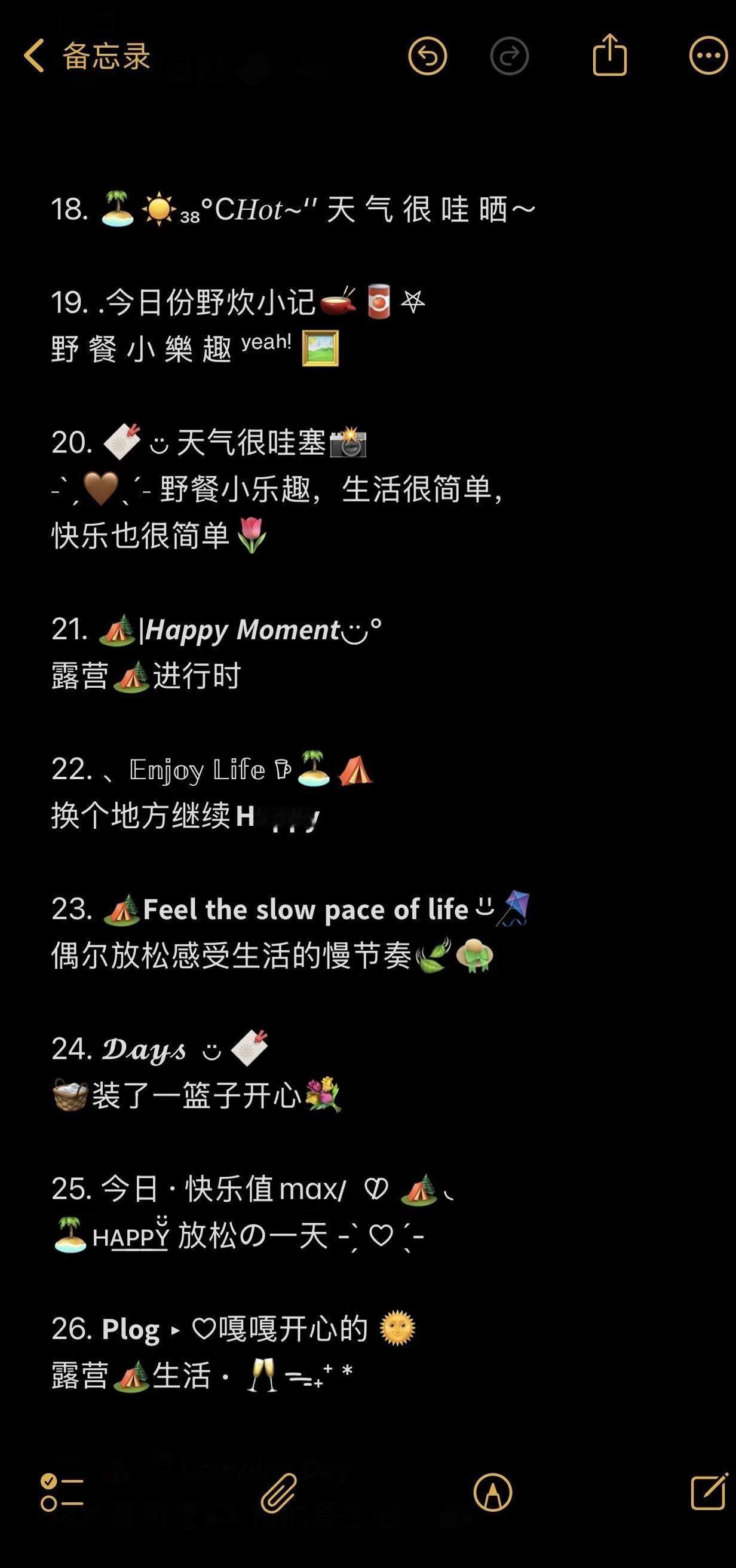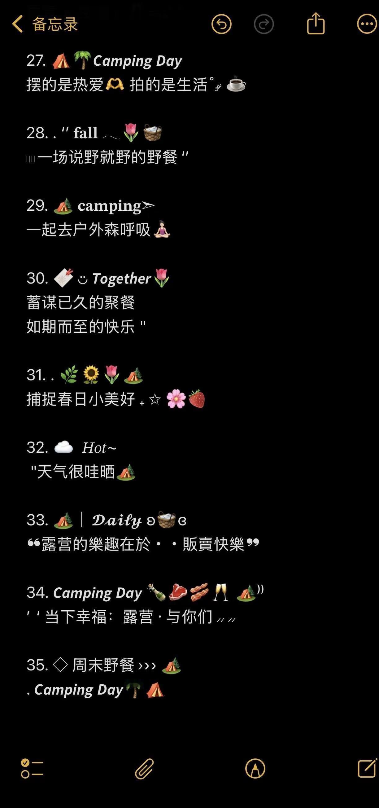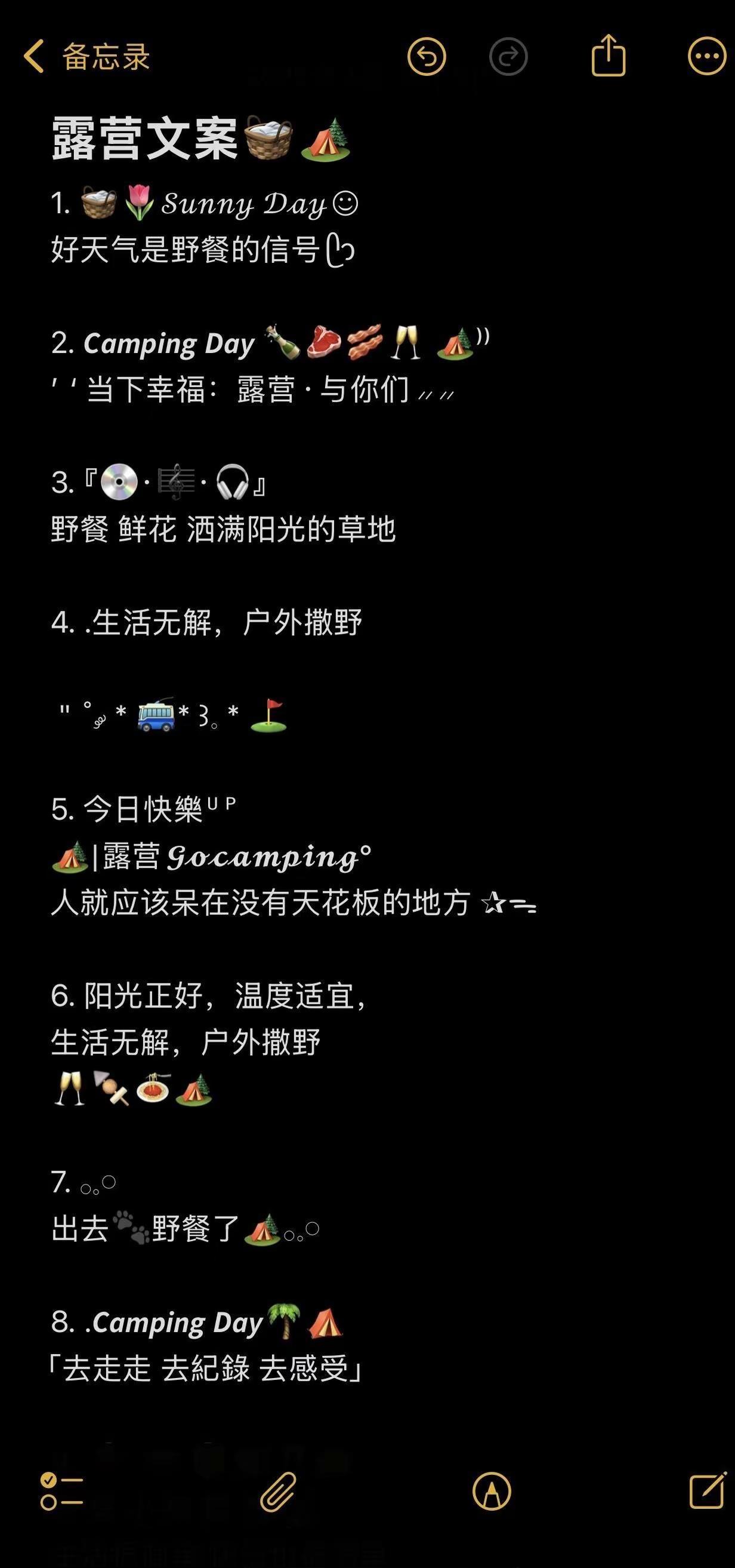 露营文案|户外露营🏕️ 1. 🧺🌷𝒮𝓊𝓃𝓃𝓎 𝒟𝒶𝓎☺︎好天气是野餐的信号ᥫᩣ2. 𝘾𝙖𝙢𝙥𝙞𝙣𝙜 𝘿𝙖𝙮 🍾🥩🥓🥂 🏕️⁾⁾’‘ 当下幸福:露营·与你们 ⸝⸝ ⸝⸝3. 『💿·🎼·🎧』野餐 鲜花 洒满阳光的草地4. .生活无解,户外撒野"˚ ༘ * 🚎* ꒱𓈒 * ⛳️5. 今日快樂ᵁᴾ🏕|露营𝓖𝓸𝓬𝓪𝓶𝓹𝓲𝓷𝓰°人就应该呆在没有天花板的地方 ✰ᯓ6. 阳光正好,温度适宜,生活无解,户外撒野🥂🍢🍝🏕7. 𓂂𓈒𓏸出去🐾野餐了🏕️𓂂𓈒𓏸8. .𝘾𝙖𝙢𝙥𝙞𝙣𝙜 𝘿𝙖𝙮🌴⛺️「去走走 去紀錄 去感受」9. .🎈 📸 🍞🍽🥂🍰野 餐 小 樂 趣 🧺🏕️生活很简单 快乐也很简单10. 天气晴🔆宜野餐🏕️惬意⛱️11. 𓂃🏕️🧺𓏽一起露营吧!.﹆﹆阳光 微风 野餐”🥂12. 、🚗ᐛ🏕️ ,🌿🛶⌇、🩹𖦹𖦹.ᐟ用生活治愈生活˗ˋˏ❤️ˎˊ˗13. 野营⛺️ɴɪᴄᴇ ᴅᴀʏº🥑🎨🩰🎯🎳🎪🎬