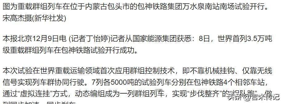 中国铁路震撼世界!3.5万吨“钢铁巨龙”如何颠覆全球运输规则? 你见过几万吨的火车,像一支训练有素的无人机编队,在铁轨上无声协同穿行吗?就在内蒙古的包神铁路神朔段,一列总重3.5万吨的重载列车悄然启程。这个重量,相当于500辆主战坦克同时开火冲锋,但它的运行方式,却比最精密的舞蹈还要协调。更让人不敢信的是,这七组各重5000吨的列车之间,竟然没有一根物理连接的锁链,全靠北斗导航和5G信号“隔空握手”,完成毫秒级同步。 说实话,以前搞重载铁路,大家的思路都很粗暴——车头够猛、链条够粗、车皮够多就行。像澳大利亚的必和必拓矿运线,上百节车厢硬怼在一起,拉得动是拉得动,可一旦中间哪节出点毛病,整条线就得趴窝几小时。组装拆解都得花大半天,活像个移动的钢铁积木,笨重得要命。可咱们这次不一样,七列车各自独立运行,到了站点说散就散,兵分七路进不同站卸货,处理完又能迅速重组出发。这种灵活度,简直是把铁路玩成了“轨道上的特种部队”。 背后靠啥撑着?首先是北斗系统,每列车的位置定位精度控制在厘米级。你想啊,几万吨的钢铁巨兽,稍微偏个半米,追尾可不是闹着玩的。再加上5G低时延通信,指令下发到执行,响应时间不到一秒。这玩意儿在美国根本玩不起来,他们那破铁路网,不少还在用上世纪的信号系统,连准点都保证不了,更别说搞什么虚拟连挂了。俄亥俄州那场毒化学品列车出轨,不就是个活生生的例子?枕木烂了、轨道歪了,公司宁愿分红也不修路,图啥?因为在美国,铁路不是战略资产,是财报数字。 咱们可不这么看。铁路是国家的血管,修它不是为了赚钱,是为了关键时刻能顶上去。这套群组列车技术一旦铺开,战时物资调度、能源紧急外运、矿产快速输出,全都能“随编随走”。你要三万吨煤,一晚上就能从山西拉到港口;要调装备,编队拆解再集合,比拆乐高还利索。这已经不是运力的问题了,是整个工业体系柔性和响应速度的质变。 最狠的是,这背后拼的不是单一技术,而是整套国家能力。从自研的北斗导航,到全国覆盖的5G网络,再到工业级AI算法和超算调度系统,哪一块短板都会让整个系统崩盘。可我们偏偏把这些全都啃下来了。现在人家还在比谁的火车长,我们已经在琢磨怎么让七列火车“心神合一”了。这不是超越,是换赛道了。 你细品,这列钢龙跑起来的时候,震动的不只是铁轨,还有那些以为自己还站在工业顶端的人的认知。以前的铁路像老牛拉车,现在我们直接上了智能高速路。未来这种编组方式会越来越多,可能哪天你就看到一列万吨级列车,悄无声息地分兵三路,各自奔赴不同目的地。而这一切,已经在神朔线上,悄悄开始了。