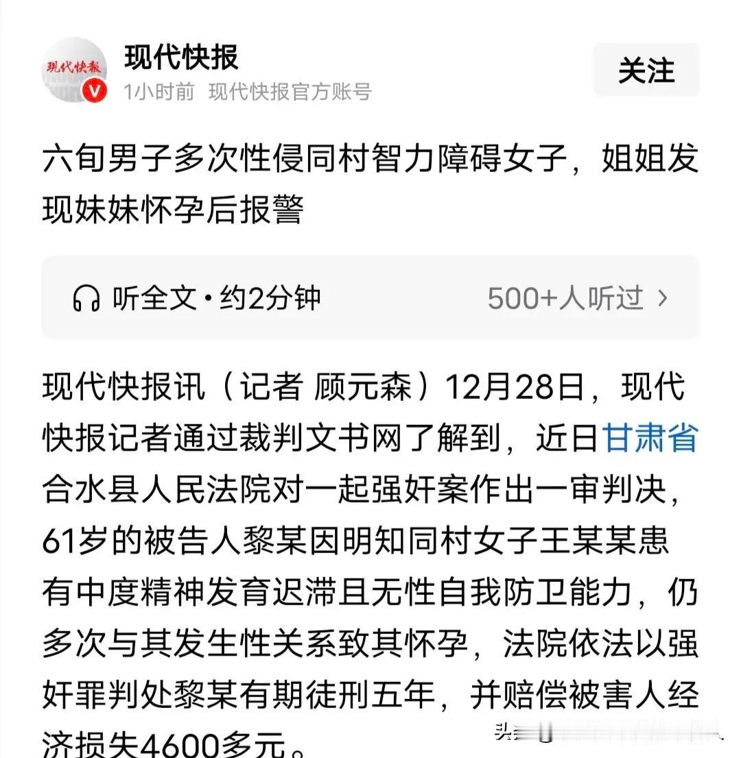 太缺德!甘肃61岁男子性侵智力障碍女子,4个月内作案6次终获刑 甘肃合水这事儿真让人愤怒!61岁的黎某和同村34岁的王某某搭顺风车相识,发现她智力异于常人后,不仅没同情,反而起了歹念。 从2025年3月到7月,4个月里黎某利用王某某无法认知、无力反抗的弱点,在家中先后6次对她实施性侵。直到8月初,王某某怀孕,行为反常被细心的姐姐发现,追问下妹妹说不清楚情况,姐姐赶紧报警,还带她做了流产手术——毕竟妹妹有智力残疾,生下孩子只会更难。 司法鉴定确认,王某某是中度精神发育迟缓,没有自我防卫能力,这也成了定罪关键。黎某明知对方情况还屡次侵害,完全符合强奸罪构成要件。最终法院判他有期徒刑5年,赔偿经济损失4600多元。 有人疑惑为啥只判5年?因为黎某当庭认罪认罚、有坦白情节,按规定可从宽处理。但不管怎样,欺凌弱势群体天理难容,法律的判决既是惩罚也是震慑。邻里之间本该互帮互助,对无力反抗的人下手,必然要付出法律代价!