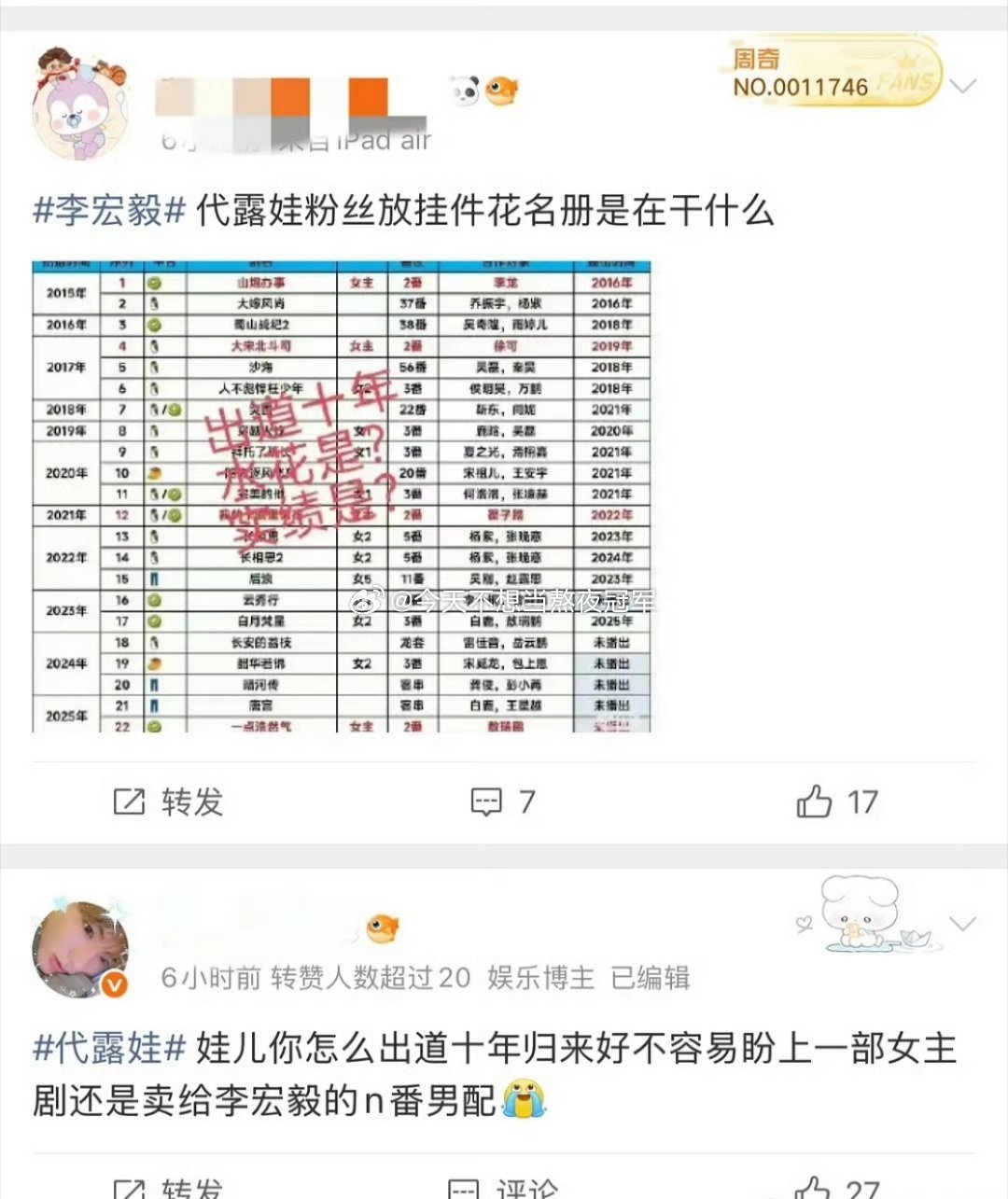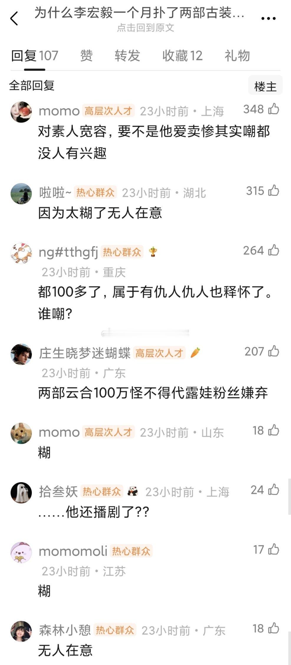 一个热知识,李宏毅近一个月连着播了两部剧,而且集均都才100w。网友说李宏毅作品无人知,最近唯二出圈的代表作只有:限高和抵 制代露娃李宏毅在95🥜生里有姓名还算比较早的,前两年还是平台买股的95待爆生,现在怎么混成这样了。。。