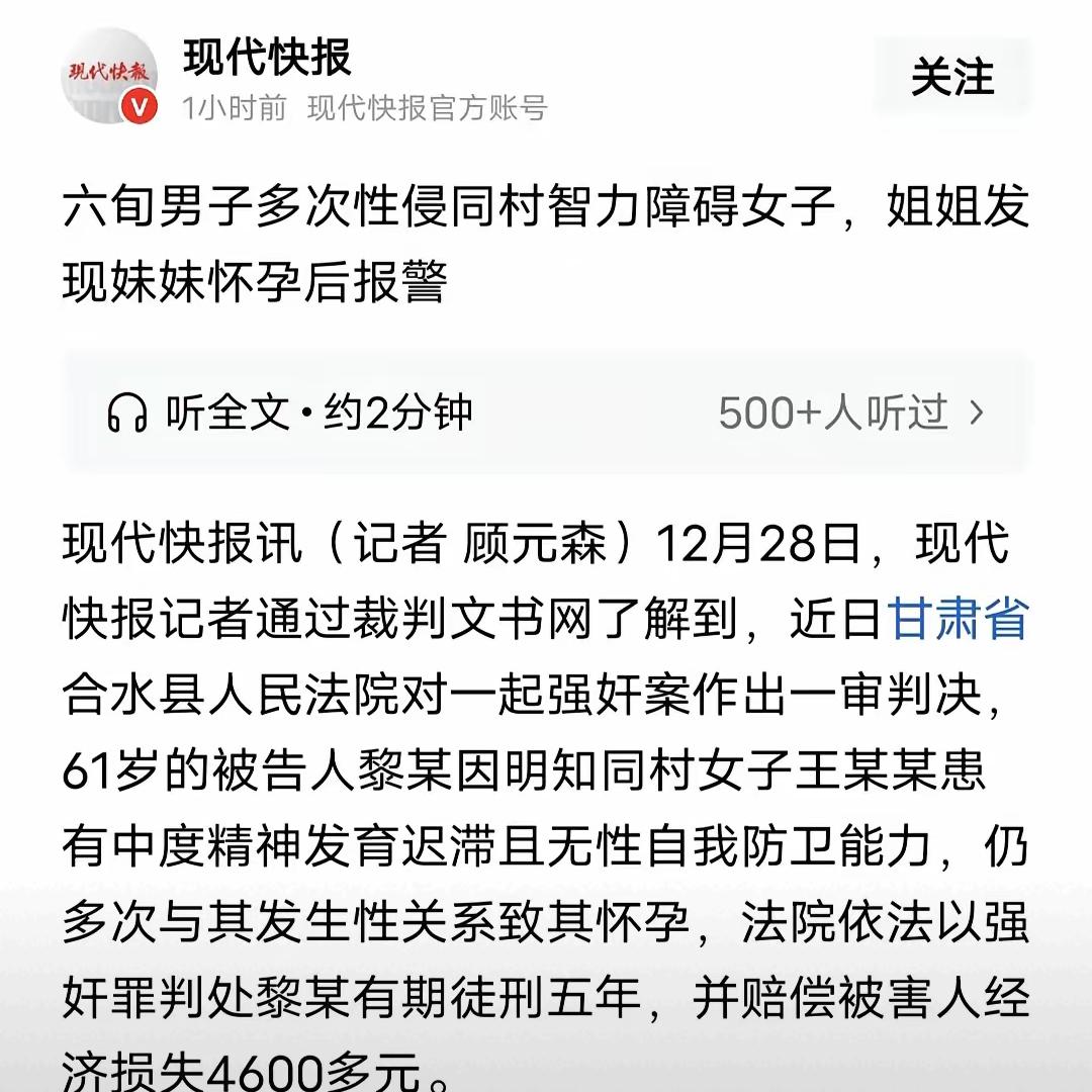 判5年,赔4600元,这就是一个智力障碍女子四次受害的代价。 第一次是同村黎某发现她智力异常后,在4个月内6次侵犯她;第二次是身体受损被迫流产;第三次是司法鉴定中反复被揭开伤痕;第四次是社会总将这样的悲剧简化为数字。 法律用强奸罪定罪,强调明知对方无性防卫能力即构成犯罪,但判决后呢?那些无法表达的痛苦,依然卡在弱势群体的生存缝隙里。 类似案件中,有人将智障女视为免费劳力殴打致轻伤,有人借阴婚牟利杀害她们。 当保护总滞后于伤害,再严厉的刑罚也难填社会关怀的缺口。 法律能严惩恶人,却难唤醒麻木。