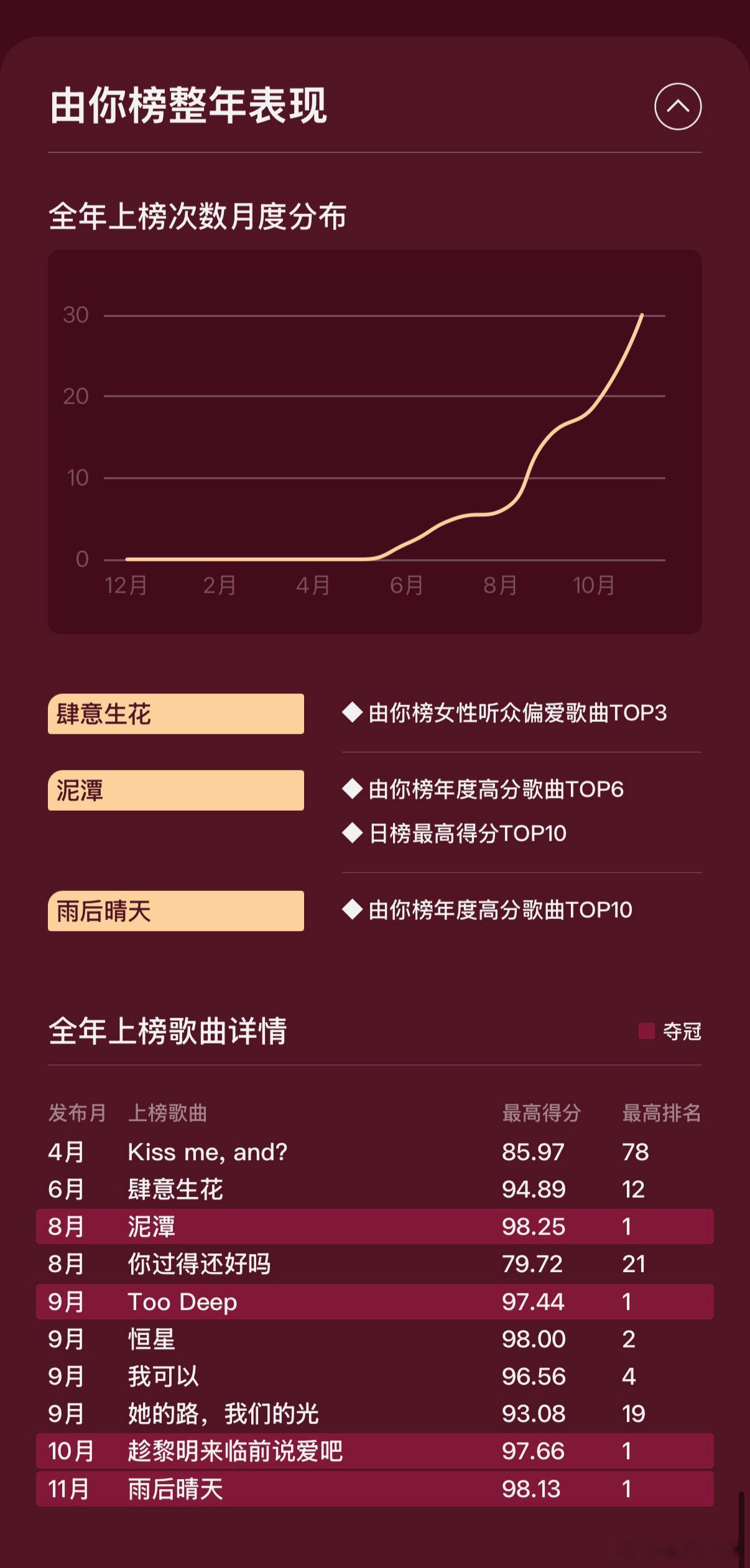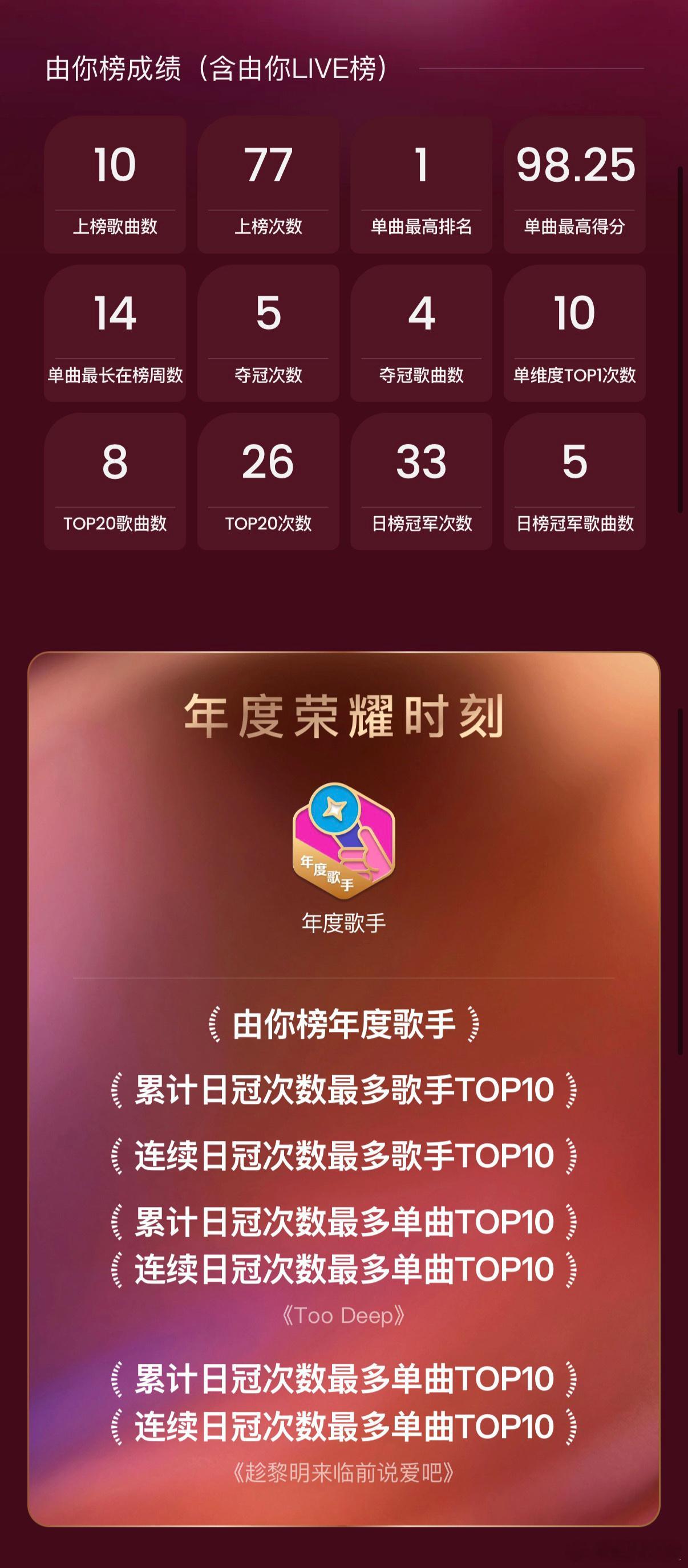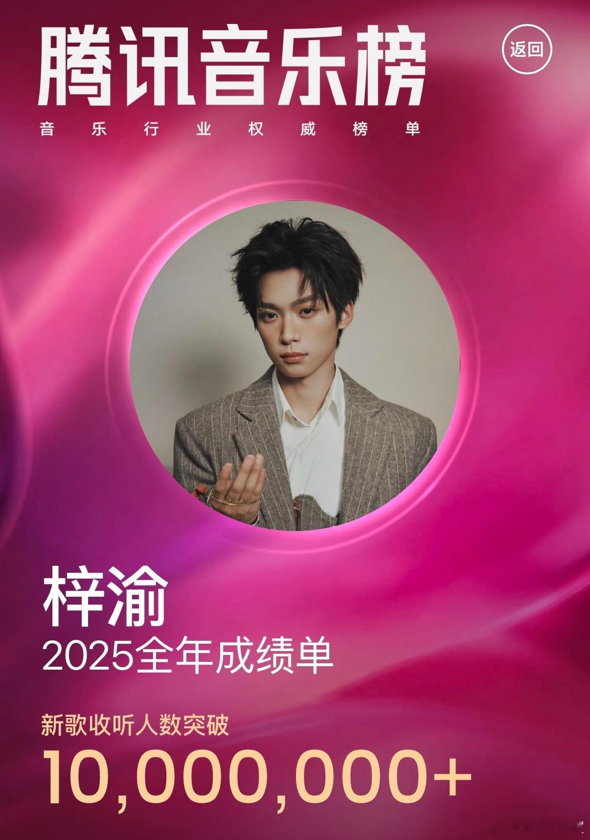 梓渝QQ音乐实绩,新歌收听人数破10000000+,上榜歌曲12首,全年77次上榜,单曲最高排名top1等,各方面数据都是碾压,太牛了!