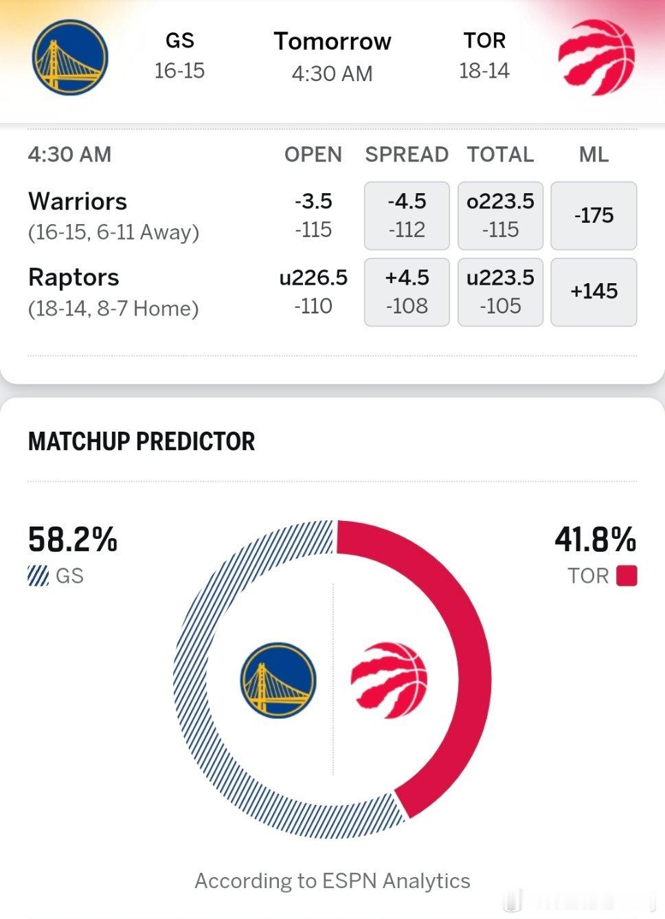 明天凌晨看比赛的来举个爪!比赛预告:明天凌晨4:30勇士客场挑战猛龙!目前三连胜,正处于关键期!定好闹钟,你们今晚看不看???勇士伤病报告:波杰姆斯基大概率出战,梅尔顿、赛斯库里缺席猛龙伤病报告:巴雷特、博伊尔斯出战成疑,珀尔特尔缺席ESPN预测双方胜率:勇士58.2%,猛龙41.8%,勇士-4.5分