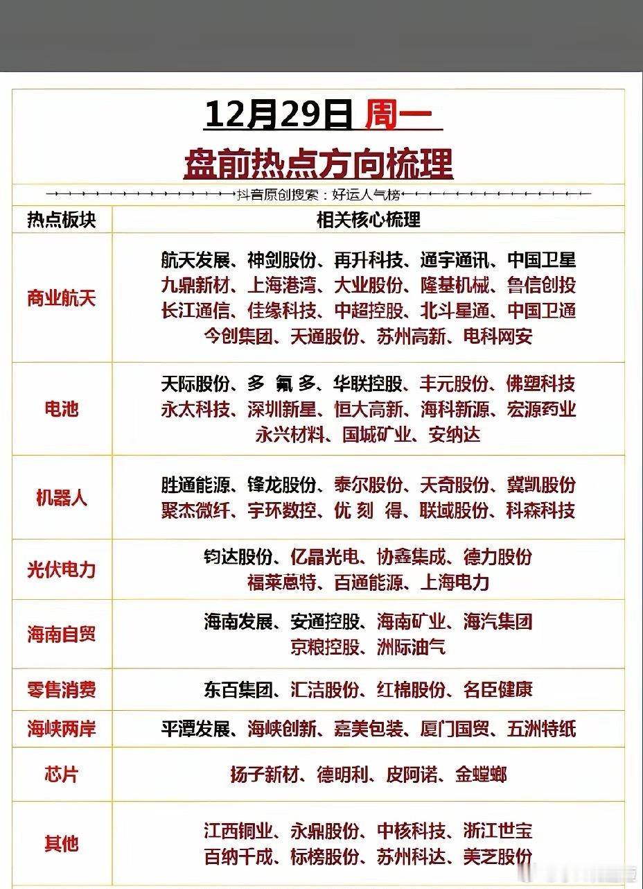 12月29日,周一盘前A股热点梳理!!!商业航天板块:航天发展、神剑股份、中超控股;电池板块:多氟多、海科新源、安纳达;机器人板块:胜通能源、锋龙股份、泰尔股份;光伏电力板块:钧达股份、亿晶光电、协鑫集成!!!股市分析