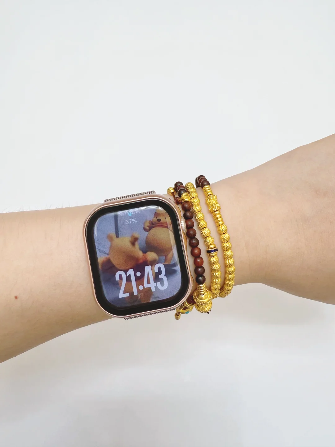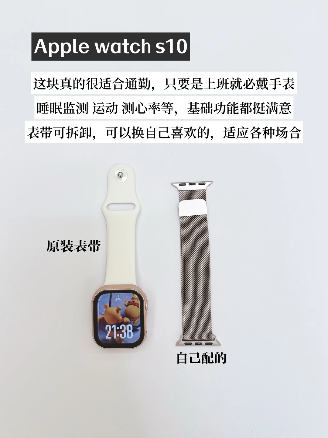 分享我的上班搭子们: 1️⃣Apple watch s10 这块真的很适合通勤,只要是上班就必戴手表 睡眠监测 运动 测心率等,基础功能都挺满意表带可拆卸,可以换自己喜欢的,适应各种场合 2️⃣黄金手串 黄金 血脉觉醒的这几年,买了不少黄金饰品 超满意的手串就是这个黄金和小叶紫檀的结合 无论是当作项链佩戴,还是绕三圈戴在手腕上,都非常舒适,且具有层次感 3️⃣戒指 戒指偶尔想起来了就戴,没有天天戴 不过也是经典百搭款的,穿什么衣服都可以配 不喜欢麻烦,需要挑怎么搭的物品