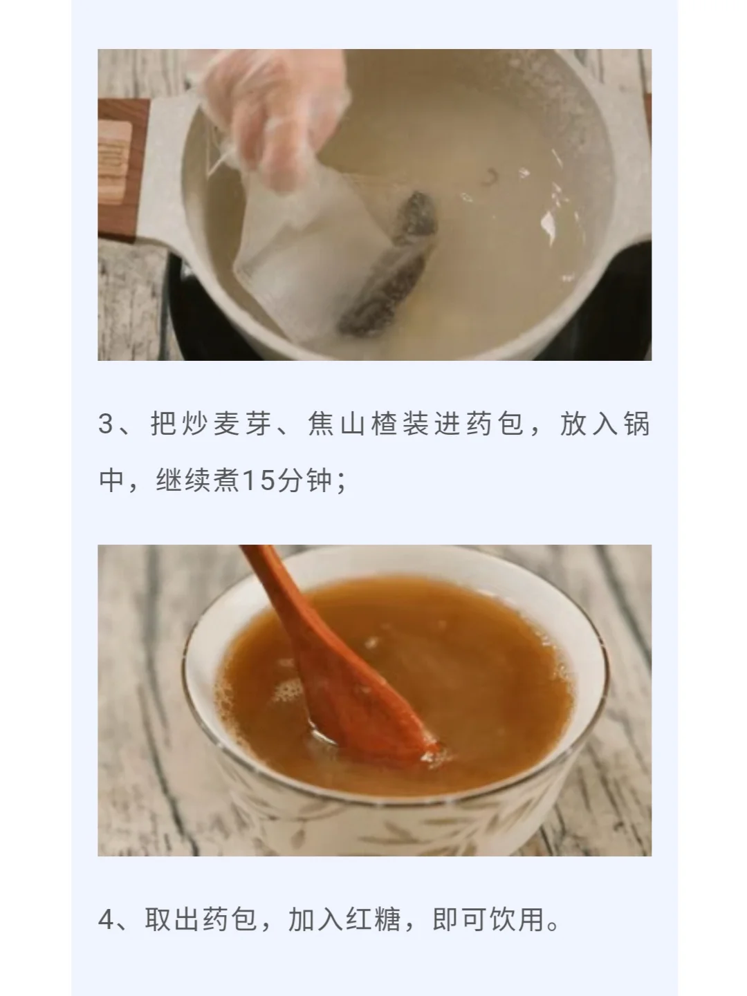 一转眼春节假期已然过半,这几天孩子们都吃的好吗?食欲如何? 如果孩子出现了食欲不佳、积食的情况,今天的这碗简单好喝的开胃汤就可以上场啦~ [清单R]原料:炒麦芽6g、焦山楂6g、红糖10g,莲子肉15g,山药20g 做法如上图 [彩虹R]这里用的是焦山楂,而非生山楂,是因为生山楂对孩子来讲力道太猛,一般中医用炒黑的焦山楂来消食,效果会比较好。中医认为,炒焦的东西,本身就有消食的作用,焦山楂实际上和炒山楂是一样的,它有山楂的药性,却又没有那么猛烈,更适合孩子。不过焦山楂不要直接吃,还是煮水喝的效果比较平和。 这道汤在孩子胃口不好,有积食时,喝1~2天就可以了,不要长期服用哦!