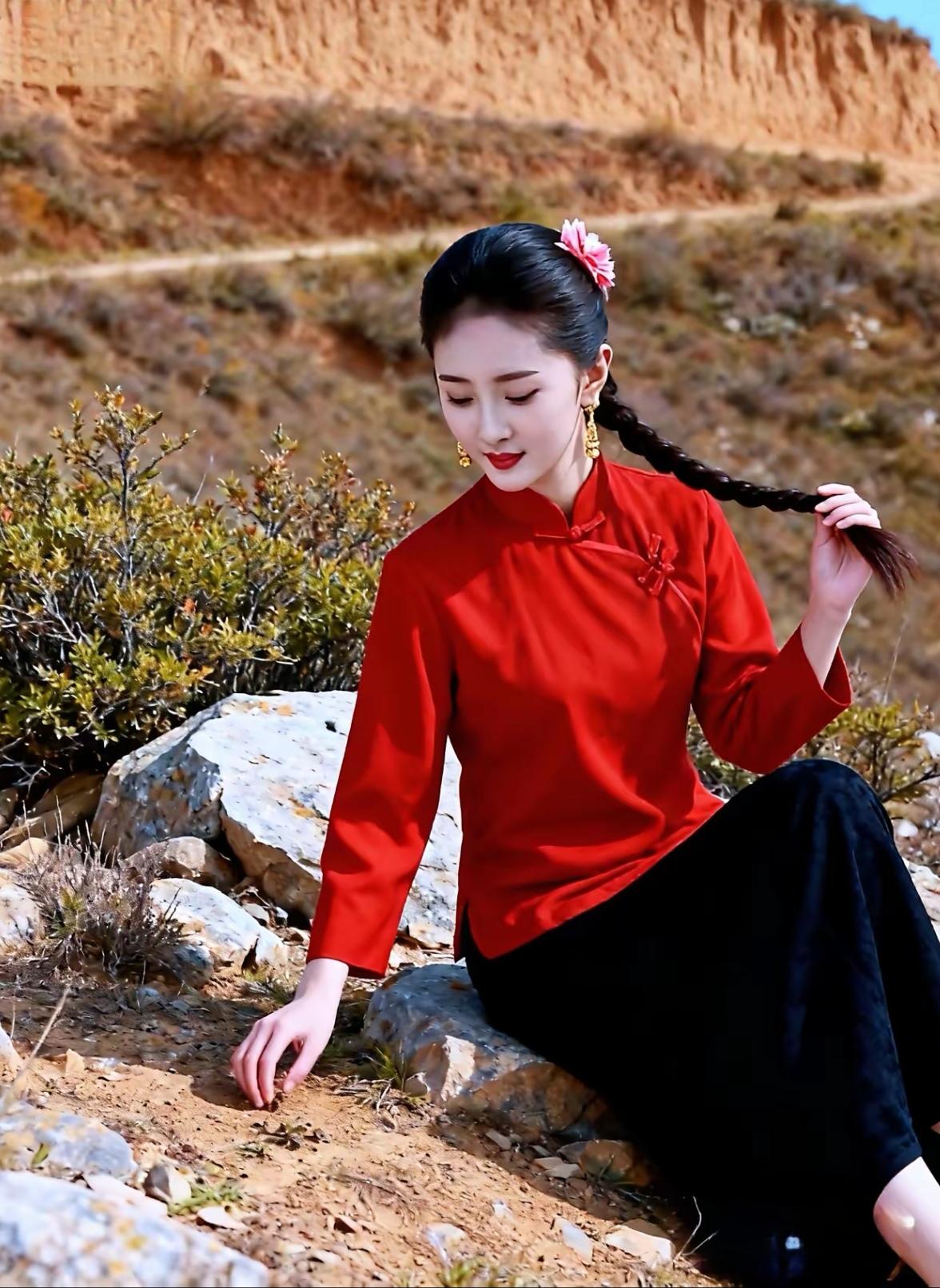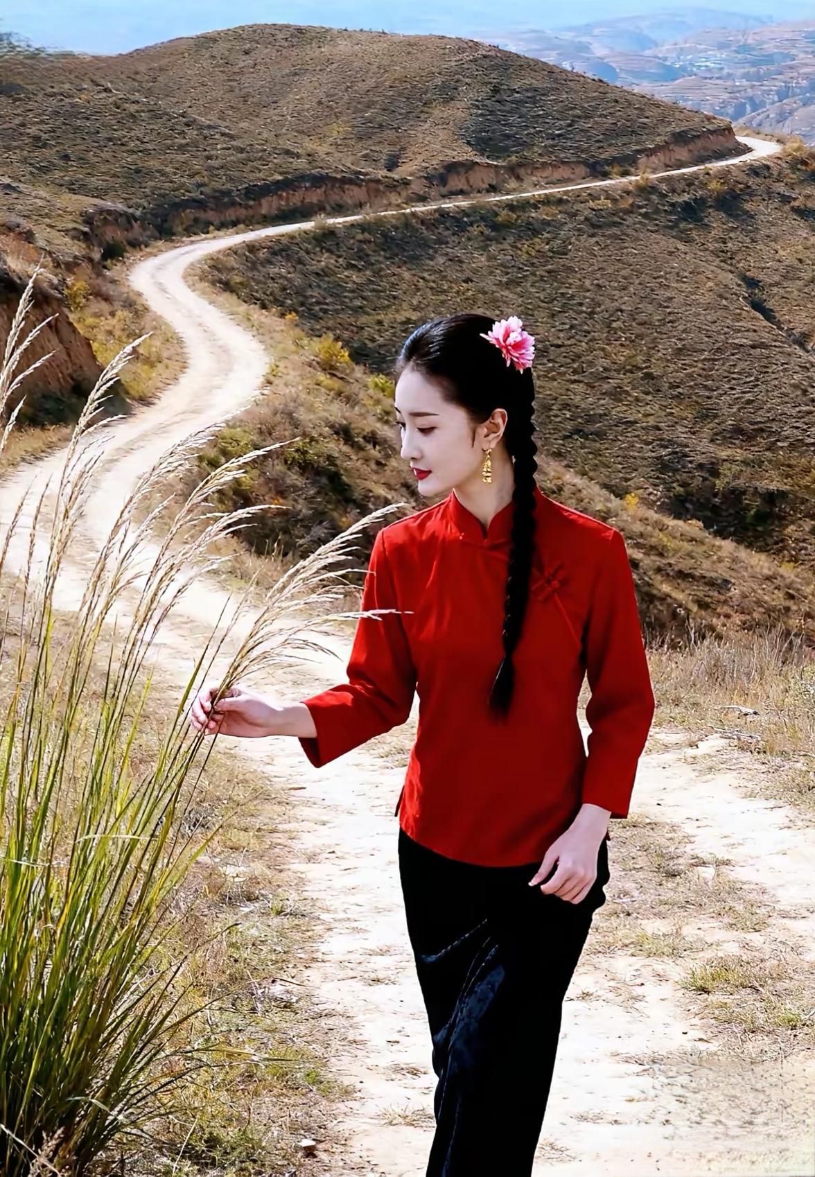 优雅粉裙,山间仙子,轻抚发丝,静享自然之美。