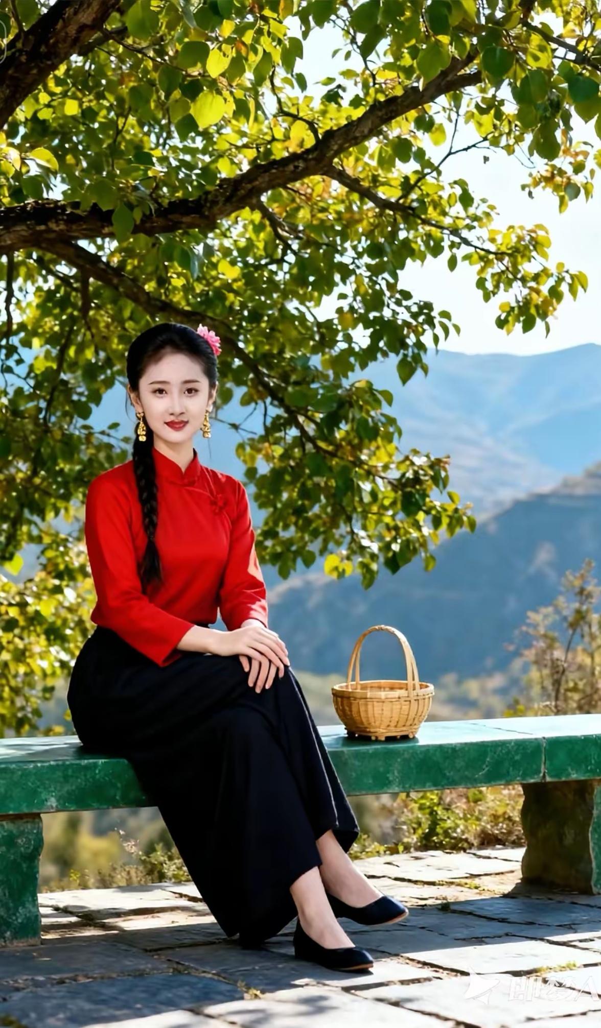 阳光下的梦幻少女,坐在松树下,裙摆随风飘动。
