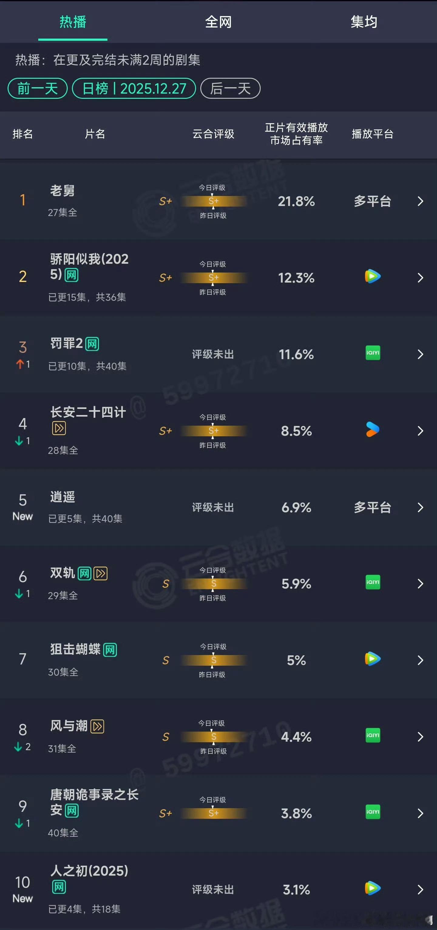 12.27云合:~老舅21.8%~骄阳12.3%~罚罪11.6%~逍遥