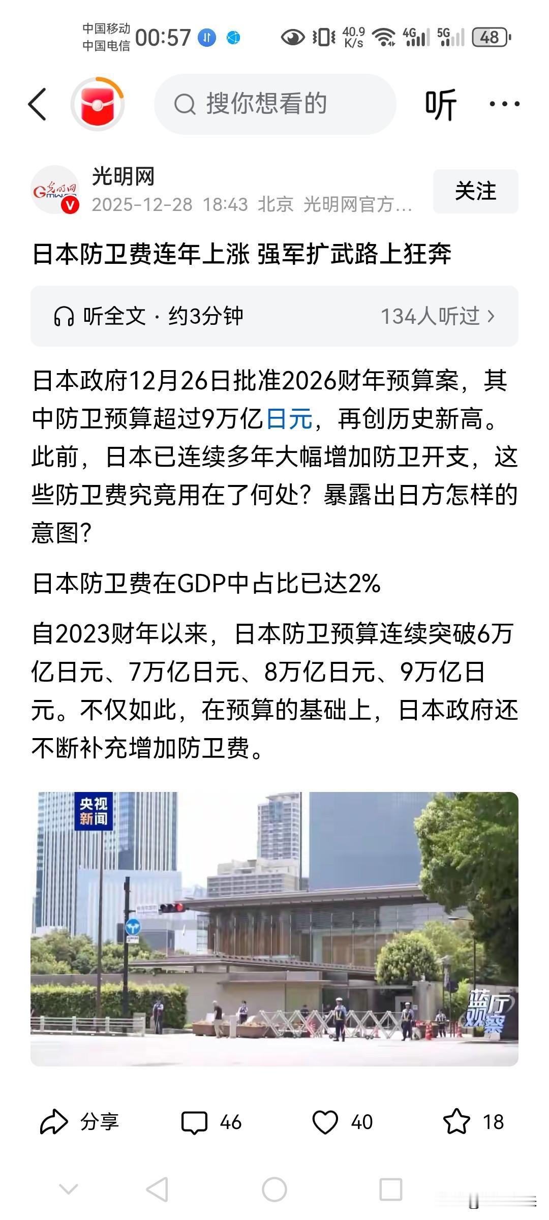 日本的野心越来越大! 不断增加防卫费预算,目的就是扩充装备提升日本自卫队的整体战斗力! 并且近期日本还免费向12国家提供武器装备,并且这12个国家都跟中国不是很友好,摩擦不断!典型就是菲律宾! 自从高市早苗上台以后,日本的防卫费(军费)也是再创新高,2026年的防卫费预算直接达到9万亿日元折合美元是570多亿美元,可以排进世界前十! 日本的在野党不禁发出灵魂拷问,增加这么多预算到底钱花在哪,肯定花在武器装备上! 中国2025年的国防预算约2500亿美元,2026的国防预算还没有公布,只会多不会少!中国军费预算稳居世界第二! 美国2026年的国防预算已经获得国会参众两院通过9010亿美元,依然位居世界第一!
