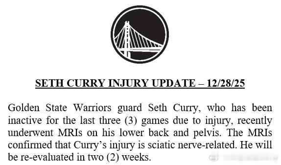 塞斯·库里被诊断出患有坐骨神经痛,两周后复查。已连续缺席三场的小库里接受了腰部和骨盆的核磁共振检查,结果证实与坐骨神经有关。两周后将重新评估,很可能将继续缺席更长时间。