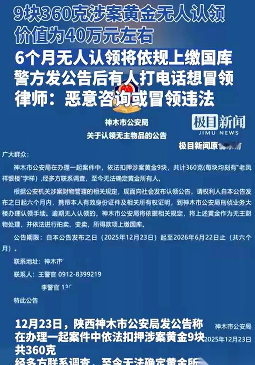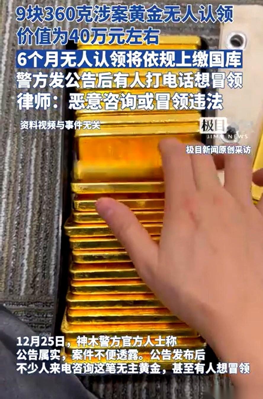 凌晨两三点,警察局电话响了。 对面那人压着嗓子,说:“喂,警察同志,我那九块金子,是我的!” 好家伙,陕西榆林这四十万的黄金,正主还没等着,先把全城惦记横财的“大聪明”都给炸出来了。 事情是这么个事儿: 警察叔叔办案,扣了九块金疙瘩,老凤祥的,三百多克,沉甸甸的。 但愣是找不到这金子是谁的。 没办法,发公告呗。半年内,你带着身份证、购买发票来认领。 过期不候,直接上交国库。 结果呢? 公告一出,真正的失主,一个没来。 想来冒领的电话,把派出所的线都快打爆了。 张口就说“是我的”,一问细节,“呃……那个……”,一要凭证,“嗨,当时买得急,票据不晓得扔哪了”。 你说逗不逗? 真当这是玩过家家呢,打个电话就能喜提四十万?把警察当傻子糊弄? 这事儿最有意思的地方就在这儿。 一头,是死活不露面的真主人。 你说他到底是心大不知道呢,还是心虚不敢来?这金子的来路,怕是比金子本身还精彩。 另一头,是一堆削尖了脑袋想浑水摸鱼的普通人。 为了点不属于自己的东西,脸都不要了,连法律的边儿都敢去蹭。 这哪是寻金启事啊。 这简直就是一张人性的考卷,一块贪婪的试金石。 可惜,太多人考了个不及格。