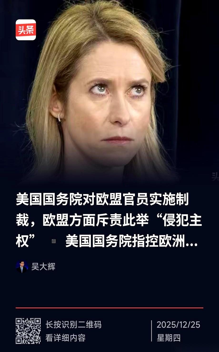 美国人直接把5个欧盟官员给制裁了。 禁止入境。 对,你没看错,是欧盟,是那帮天天跟在屁股后面的“盟友”。 就因为欧盟想审查一下美国的那些互联网大平台,动了人家的蛋糕嘛。 结果,人家反手就是一巴掌。 连英国、德国的都一块儿办了,一点面子不给。 欧盟那边直接炸了,说美国你太过分了,你这是侵犯主权,你这是搞双标! 看到这儿我真没忍住。 喊“双标”? 全世界谁不知道,论玩双标,欧盟要是称第二,没人敢称第一吧? 这事儿真就特有意思。 以前跟着大哥混,以为自己也是个人物了,可以对别人指手画脚。 现在翅膀硬了,想管管大哥的钱袋子了, 你看,大哥翻脸比翻书还快。 这脸打得,啪啪响。 也挺好,疼一下,能让人清醒清醒。 让你明白啥叫“盟友”。 所谓的盟友,不过是大哥还没跟你算账而已。