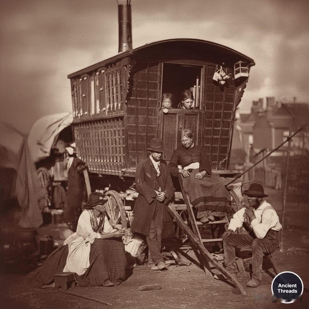 这张照片是约翰·汤姆逊 (John Thomson) 于 1877 年拍摄的名为《伦敦流浪者》(London Nomades) 的著名照片,出自他与记者阿道夫·史密斯 (Adolphe Smith) 合著的书籍《伦敦街头生活》(Street Life in London)。 摄影师约翰·汤姆逊(John Thomson),一位苏格兰先锋摄影师,以其社会纪实摄影作品而闻名。 照片拍摄于 1877 年左右,地点是伦敦巴特西 (Battersea) 的一块空地上,这里是当时许多游牧民返城过冬时的热门聚集地。 照片围绕着威廉·汉普顿 (William Hampton) 的大篷车展开,他是一位在同行中享有“谈吐得体、为人诚实”声誉的人。 该系列照片旨在记录维多利亚时代伦敦贫困阶层的生活和状况,这些人通常被主流社会所忽视。这是早期社会纪实摄影和新闻摄影的经典范例。 照片中坐在大篷车踏板上的女子玛丽·普拉德(Mary Pradd,也被称为 Mary-Ann Hunter)在拍摄几周后被谋杀。 照片采用 Woodburytype 工艺制作,呈现出丰富的棕褐色调。照片中车厢门内的两个孩子因为长时间曝光期间移动而有些模糊。