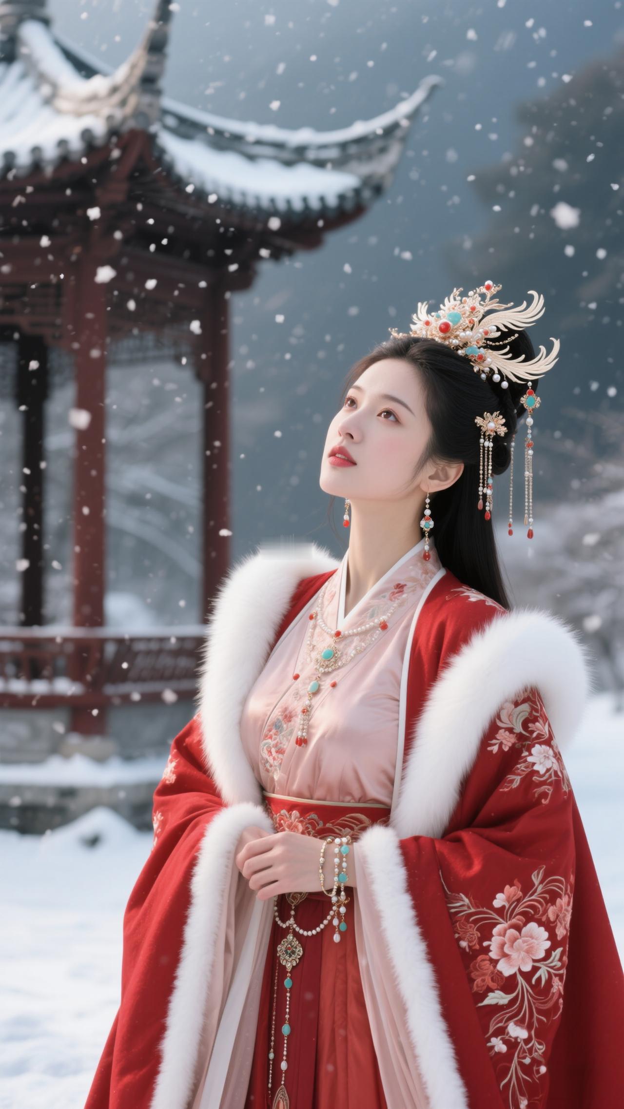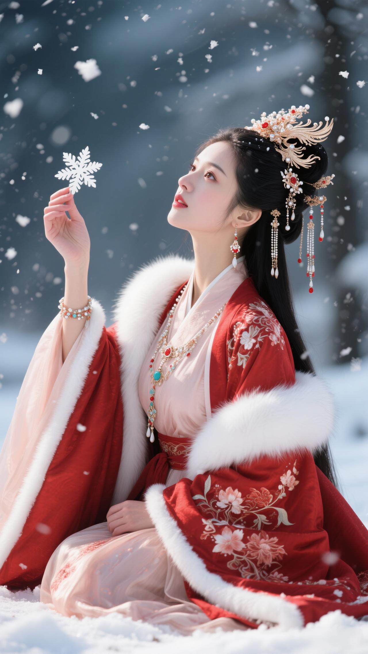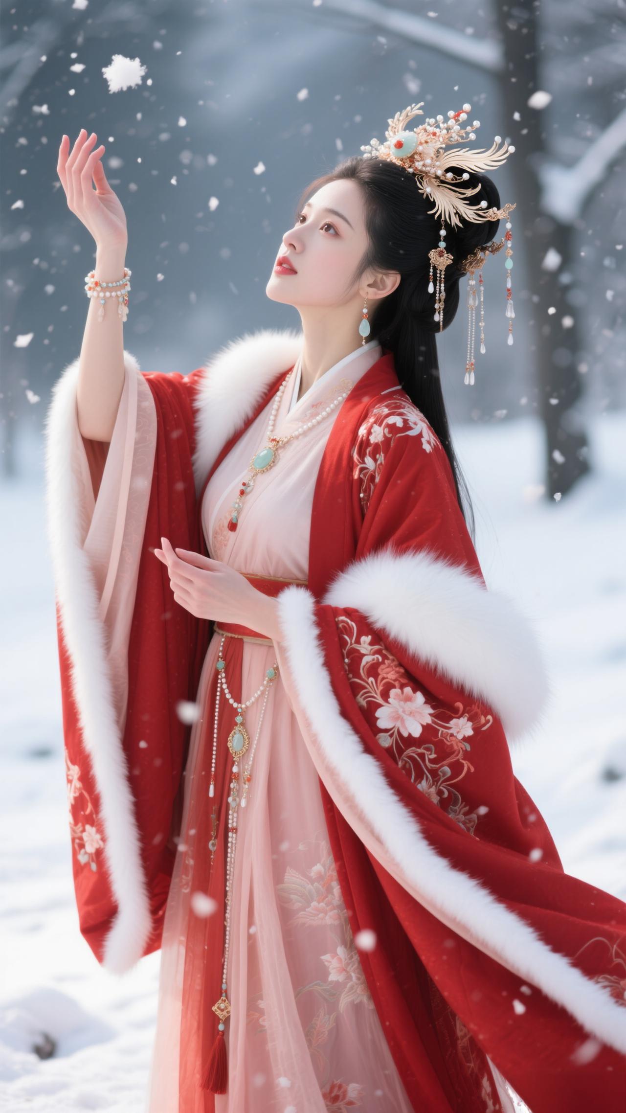 雪满庭阶,红裘裹素影,玉簪凝霜,指尖轻拈六出花。一袭绛红裁作冬日焰,粉衫衬得雪色愈清,鬓边金雀摇落琼芳,抬眸处,漫天飞絮皆成诗,恍若瑶台仙娥踏雪而来,醉了寒江,暖了冬阳。