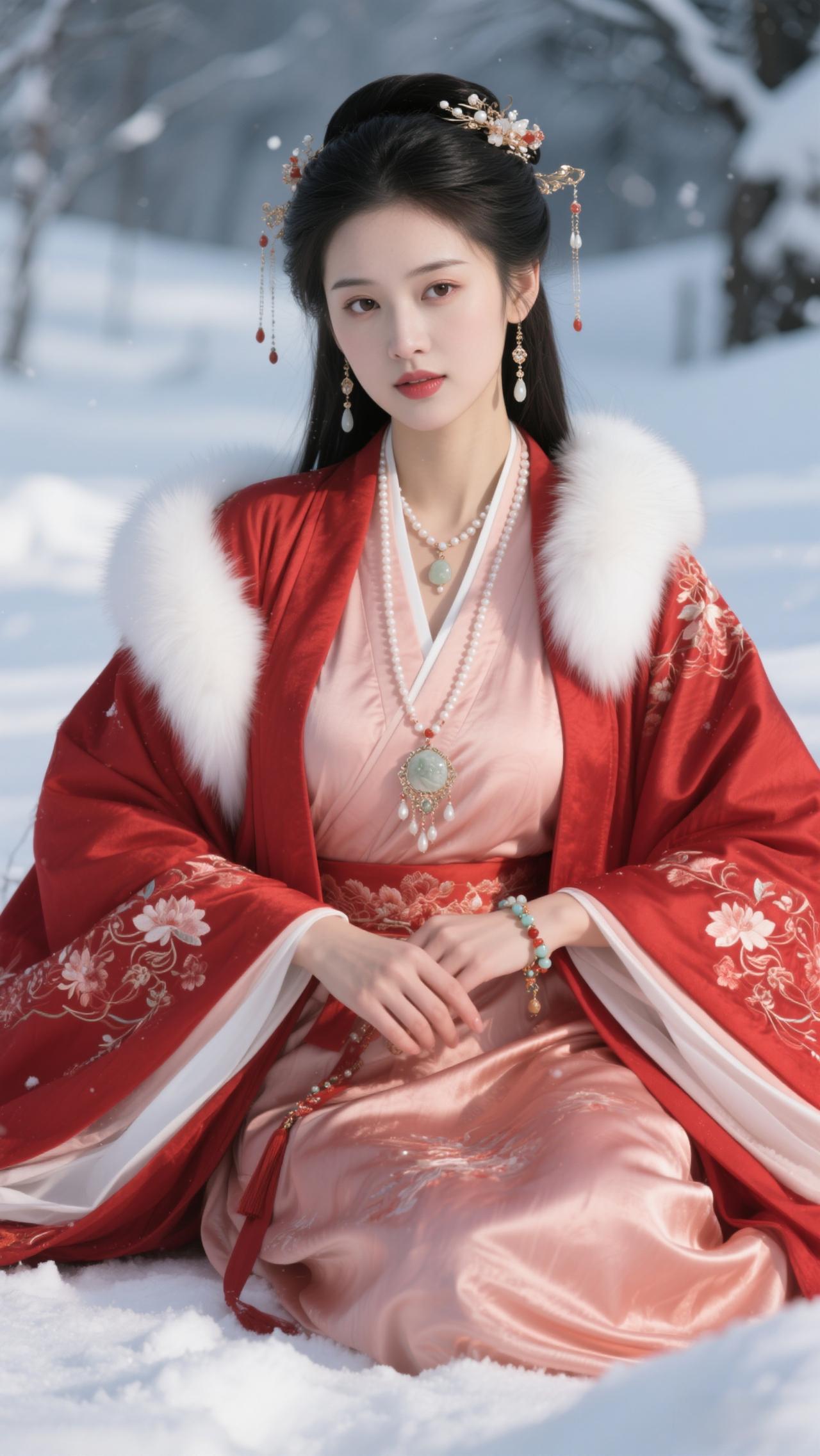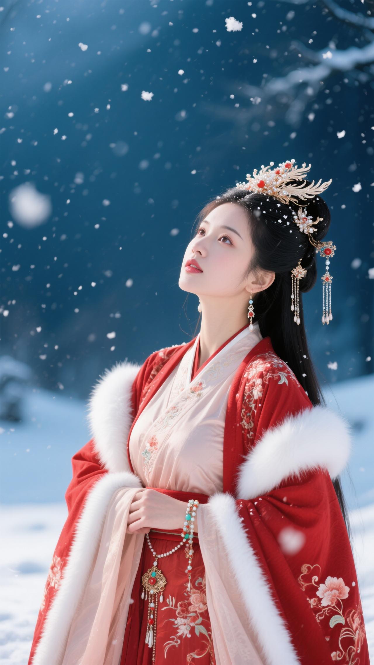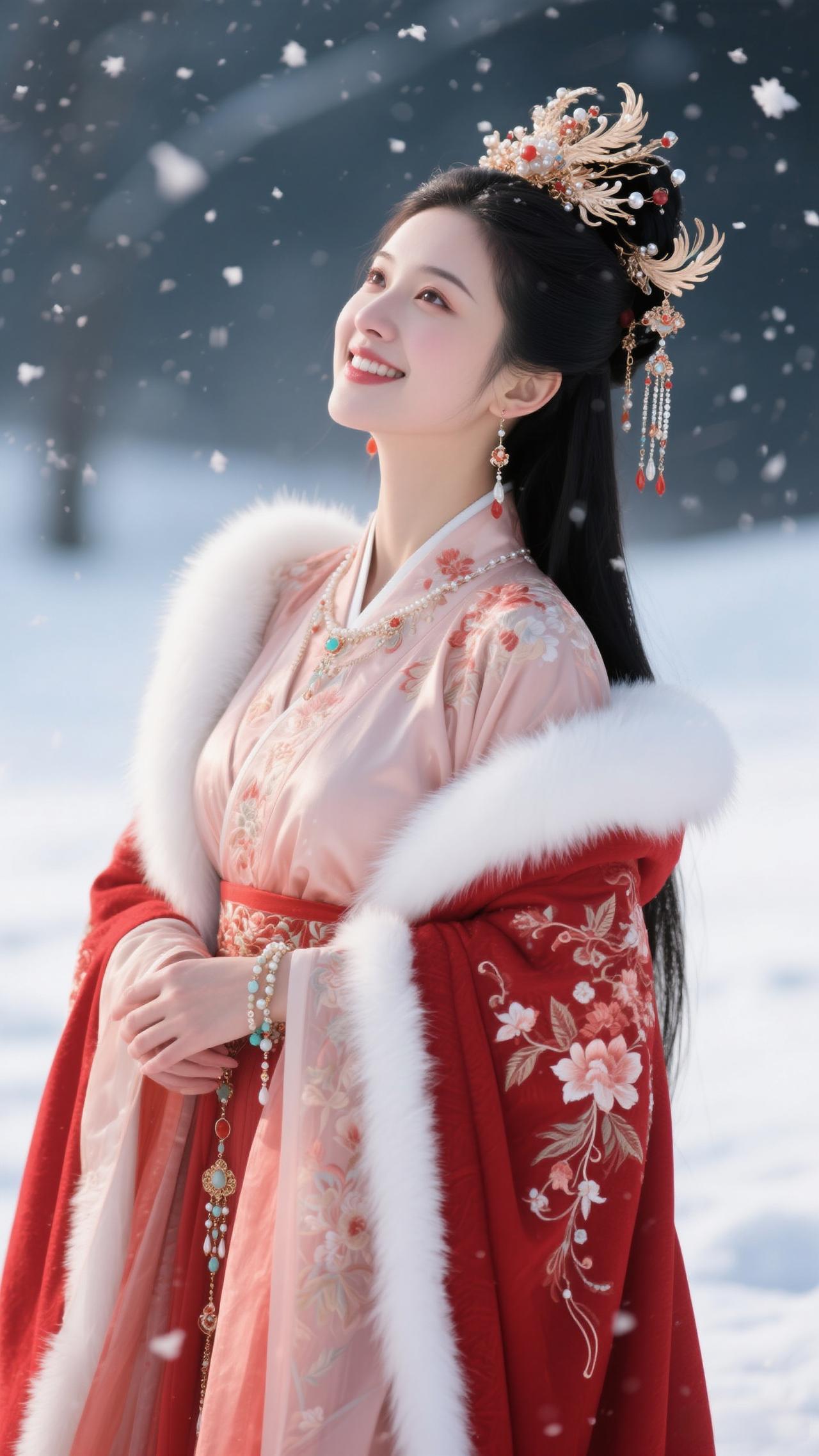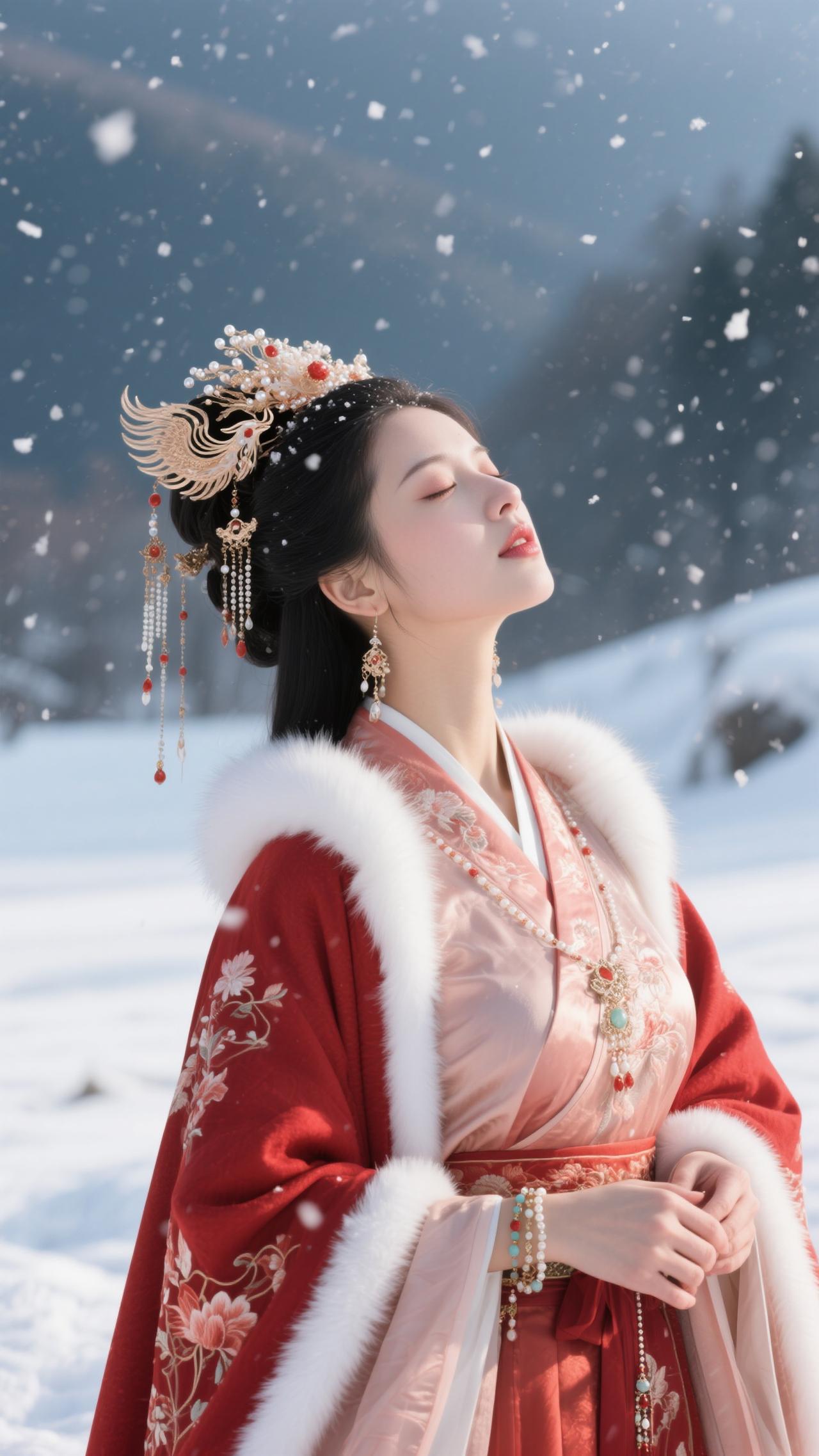 雪满庭阶,红裘裹素影,玉簪凝霜,指尖轻拈六出花。一袭绛红裁作冬日焰,粉衫衬得雪色愈清,鬓边金雀摇落琼芳,抬眸处,漫天飞絮皆成诗,恍若瑶台仙娥踏雪而来,醉了寒江,暖了冬阳。