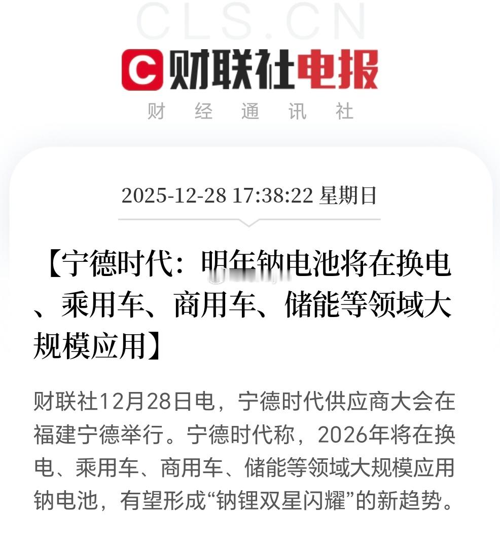 【宁德时代:明年钠电池将在换电、乘用车、商用车、储能等领域大规模应用】财联社12月28日电,宁德时代供应商大会在福建宁德举行。宁德时代称,2026年将在换电、乘用车、商用车、储能等领域大规模应用钠电池,有望形成“钠锂双星闪耀”的新趋势。(来自财联社APP)