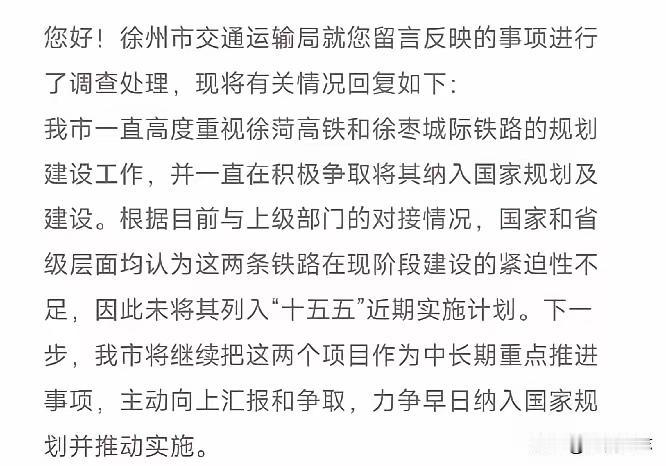 高铁 小城故事 丰沛县居民在家门口乘坐高铁的愿望,恐怕还得继续“搁置”,未来十年内怕是难以实现了。徐州官方证实,菏徐高铁由于上级部门和江苏省认为当下需求不高,已确定不会列入“十五五”近期规划,不过远景规划仍需努力争取。这意味着2035年之前,该高铁通车的可能性微乎其微。 徐州身为国家级高铁枢纽,下属睢宁县拥有2个高铁站,东也新沂、邳州皆通高铁。然而西北部的丰县、沛县至今仍未通高铁,丰县甚至连铁路都没有。好在徐州到沛县、丰县均设有快速路,在一定程度上弥补了当地百姓出行不便的问题。 徐州、菏泽并非经济发达地区,其所属县域被视作江苏的“西伯利亚”。在此投巨资建设高铁,经济收益有限,客流量也难以保障,因此苏鲁两省对此兴趣不浓。 山东 江苏 菏泽 沛县 丰县