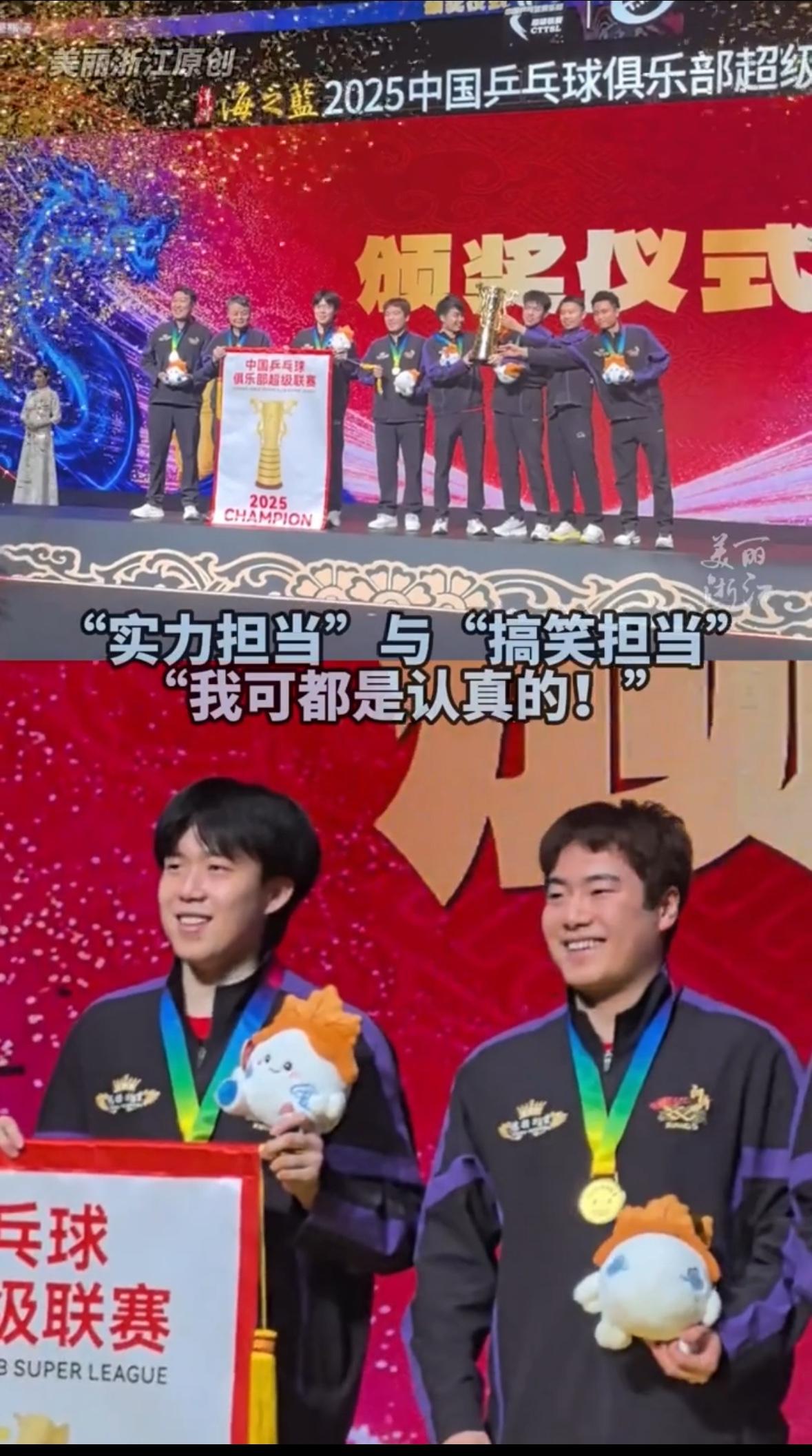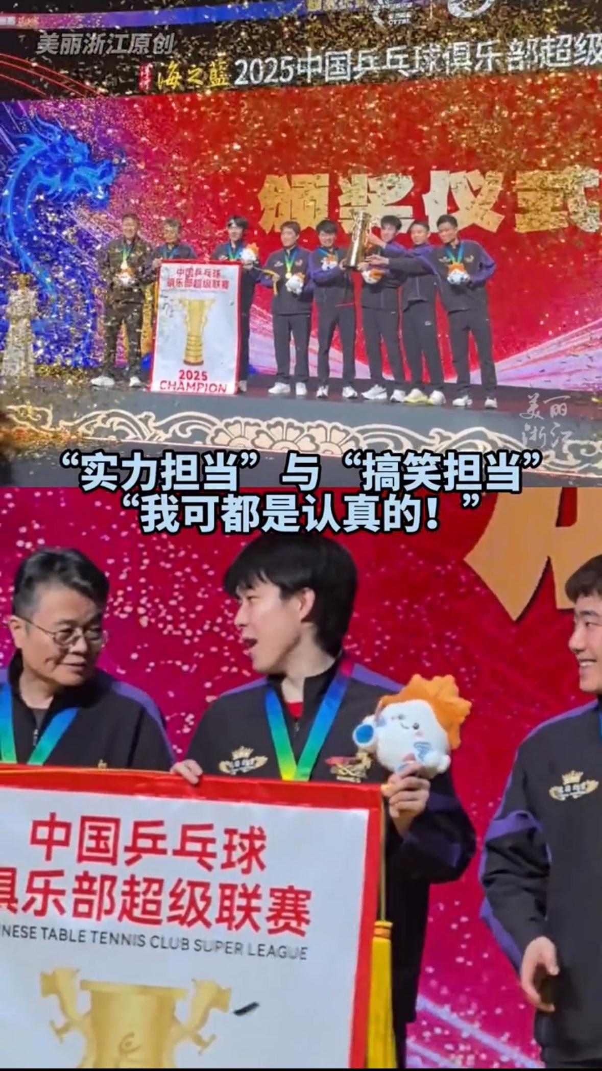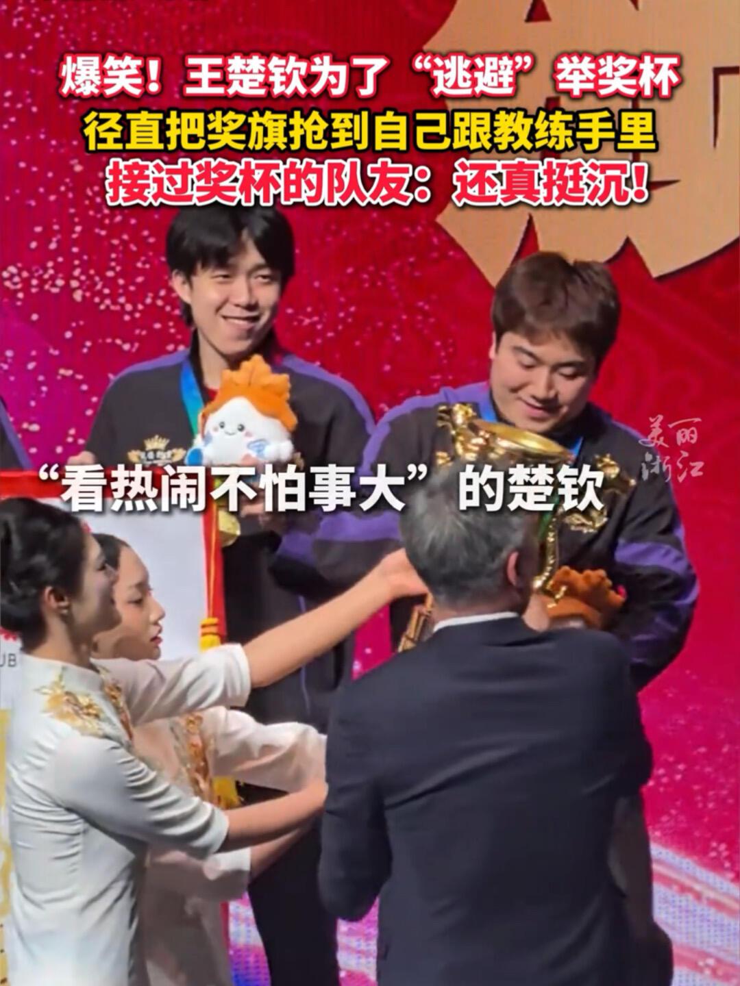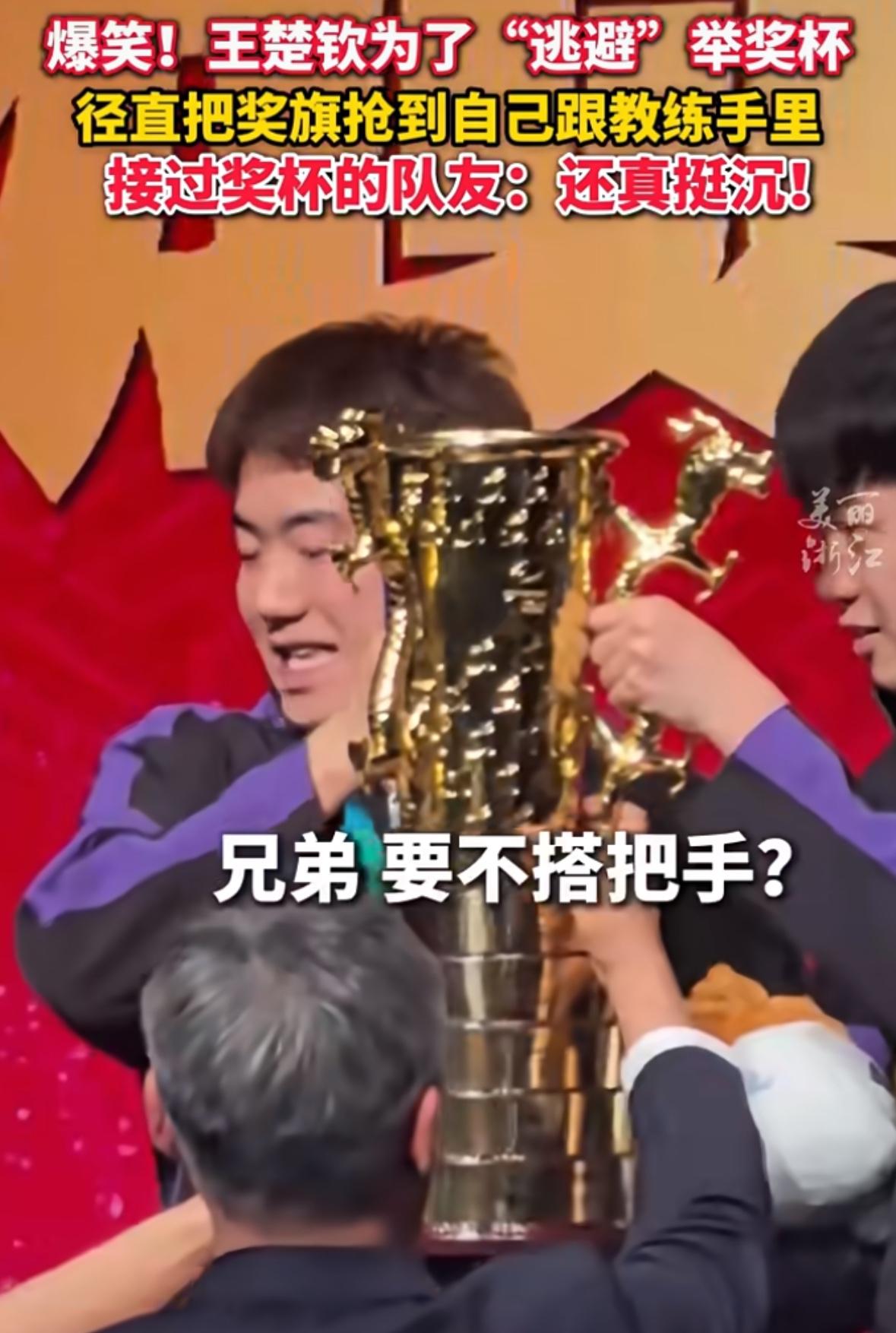 山东魏桥队太得意洋洋了,楚钦带头笑,这状态真的不像十天前受过伤! 头哥高情商,让教练举着锦旗,让队友举着高高的奖杯🏆,重量很重,也很有份量! 梁靖崑很想找个帮手,头哥在举着锦旗,根本搭不上手,这次楚钦老师全面了,做的没毛病,很让人欢喜!