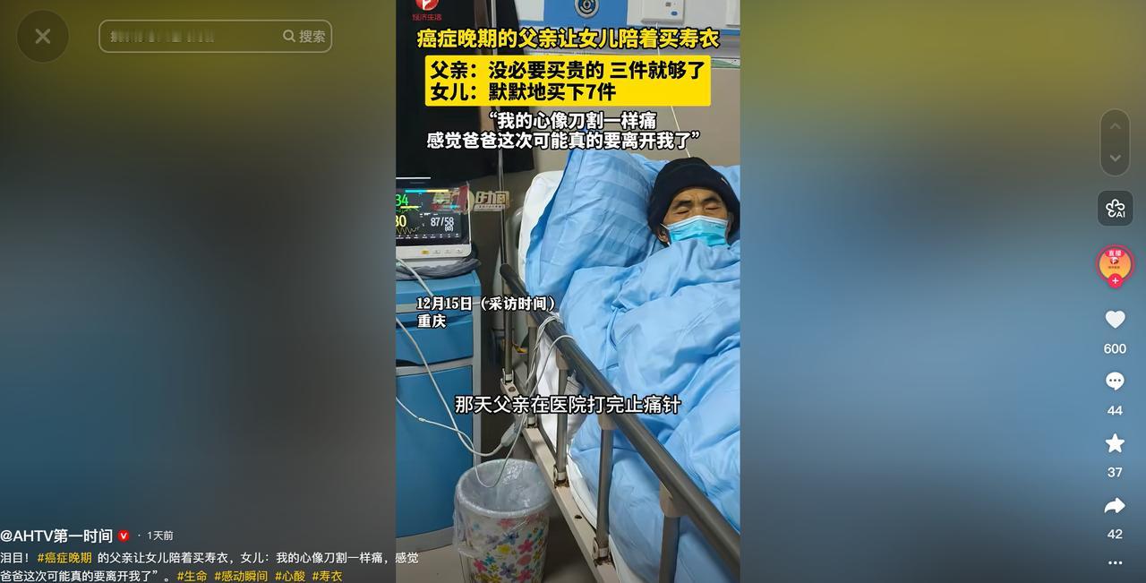 泪目!重庆一父亲肝癌晚期,突然提出,让女儿陪他出去买寿衣,女儿心里很不是滋味,到店里之后,父亲为了节约钱,还说没必要买贵的,买3件就够了!可是,女儿却默默买了7件,女儿坦言:心像刀割一样痛,感觉爸爸这次可能要离开我了! 重庆街头的风带着一股子特有的湿气,吹在身上总让人觉得发凉。杨女士手里拎着的那个大袋子并不轻,坠得手腕发酸,但比重量更沉的是她此时此刻心里的感受。袋子里装的不是别的,是刚刚从店里包好的寿衣。走在她身旁的是她的父亲,一位肝癌晚期患者。就在刚刚,父女俩完成了一场可以说是这辈子最残忍的“购物”。 那天打完针,药效上来,老人家难得精神头稍微好了一些。谁也没想到,他开口提的第一个要求,不是想吃点什么,也不是想去哪转转,而是拉着杨女士的手,平静又执拗地说:“闺女,陪我去趟寿衣店吧,趁着我现在还能走动。” 听到这句话的时候,杨女士觉得喉咙像被人猛地掐住了,酸楚直冲鼻腔。她看着父亲那双枯瘦得只剩一层皮包骨的手,想拒绝,想说“爸你别胡思乱想”,可话到了嘴边又咽了下去。她懂父亲的脾气,这辈子都不愿意麻烦别人,哪怕到了生命的最后关头,他也不想把这些身后事的难题留给女儿一个人去面对。于是,她只能硬生生地把眼泪憋回去,强装出一副若无其事的语气点点头。 进了那家店,气氛压抑得让人喘不过气。店老板见惯了生死别离,但也依旧热情,毕竟这是生意。老板指着挂在架子上的各式寿衣,嘴里滔滔不绝地介绍着这个面料高档、那个做工考究。可没等老板说几句,父亲就摆了摆那双干瘦的手,打断了对方的热情。 老人的声音不大,带着久病后的虚弱,但语气却不容置疑。他指了指角落里那几款样式最简单、最朴素的衣服,跟老板交涉:“不用整那些花里胡哨、死贵的。就那个,干净、结实就行。”他还特意伸出三个手指头,像是给自己定下了最后的预算:“买三件就够穿了,多了也是浪费钱,没必要。” 站在一旁的杨女士,看着父亲在那儿费劲地翻看衣服的布料,还在跟老板确认是不是耐穿,心里的那道防线瞬间就崩塌了。这一辈子,父亲都在为了这个家精打细算,也是这样为了省下每一分钱而跟人讨价还价,把最好的都省给了孩子。如今人都要走了,他心里盘算的依然是怎么给女儿省钱,怎么不“浪费”。 杨女士转过身,不敢让父亲看见自己泛红的眼眶。趁着父亲低头整理袖口的空档,她悄悄把店老板拉到了离柜台稍远的角落。她压低了声音,语气里带着几分恳求:“老板,刚看的那些款式,只要是合适的,您都给我包起来。我要买七件。” 她还特意叮嘱了一句:“千万别让我爸知道。” 老板是个通透人,看着杨女士那强忍泪水的样子,又看了看那边正在算账的老人,瞬间什么都明白了。他没多问哪怕一个字,只是默默地点了点头,手脚麻利地转身去打包。看着老板忙碌的背影,杨女士心里涌起一股难以言说的痛楚,像是一把钝刀子在心口上慢慢地磨。她当然知道父亲只要三件是想替她省钱,可她作为女儿,又怎么忍心让父亲走得如此寒酸? 在那一刻,杨女士心里甚至还有一种近乎迷信的执念:是不是衣服买得多一点,准备得充裕一点,父亲在这个世界上停留的时间就能长一点?这多出来的四件衣服,藏着的不仅仅是女儿想要给父亲最后的体面,更是一份面对死亡无能为力时,试图用物质填补的挽留与不舍。 结完账从店里出来,父女俩沿着那条略显冷清的街道往回走。手里拎着装满七件寿衣的袋子,杨女士觉得步子异常沉重。风比来时大了些,吹得路边的树叶沙沙作响。父亲停下脚步,把身上那件已经显得空荡荡的外套裹紧了一些,身形单薄得让人心疼。 他一边走,一边慢悠悠地开了口,语气平淡得就像在聊晚饭吃什么:“闺女啊,等我走了以后,就把我埋在老家那个后山上吧。” 杨女士还没来得及搭话,父亲又补了一句:“那个地方离路口近,以后你要是想回来看看我,也方便,不用爬太远的山路。” 没有任何铺垫,这句话直直地撞进了杨女士的心窝子。她一直咬紧牙关强撑的坚强,在这句轻描淡写的叮嘱面前彻底碎了一地。眼泪再也不受控制,大颗大颗地往下砸,瞬间模糊了视线。但她不敢哭出声,只能死死咬住嘴唇,生怕发出一丁点动静惹得父亲难受。 原来,在这个老人看似平静的外表下,每一个深夜被疼痛折磨醒来的时候,他可能都在一遍遍预演着离别。哪怕是面对死亡这样的终极恐惧,他脑子里想的依然全是女儿。他不仅仅是在给自己选墓地,他是在给活着的女儿铺平一条“想念”的路。他怕女儿以后来祭拜时受累,怕女儿爬山辛苦,所以连身后长眠的位置,都要以“方便闺女”作为唯一的标准。 那个瞬间,杨女士清晰地感知到了死神的逼近。这种“失去”不再是医生口中的医学术语,而是变成了手里沉甸甸的袋子,变成了父亲那一两句关于“后山”的碎碎念。父亲口中的“三件够了”,是他对这一生最后的克制和对子女的体恤;而女儿偷偷买下的“七件备好”,则是她在生命倒计时的绝望中,唯一能紧紧抓住的爱意表达。