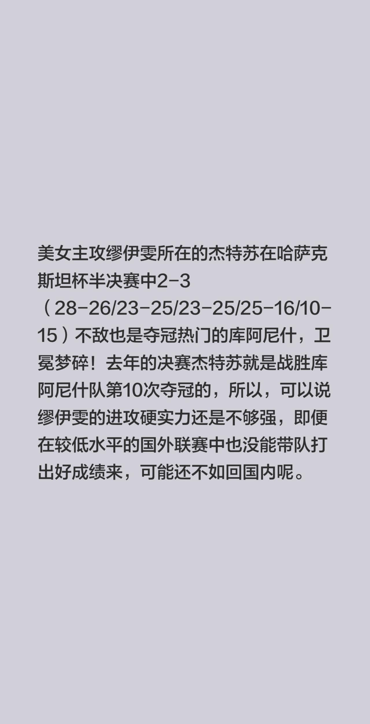 美女主攻缪伊雯所在的杰特苏在哈萨克斯坦杯半决赛中2-3(28-26/23-25/23-25/25-16/10-15)不敌也是夺冠热门的库阿尼什,卫冕梦碎!去年的决赛杰特苏就是战胜库阿尼什队第10次夺冠的,所以,可以说缪伊雯的进攻硬实力还是不够强,即便在较低水平的国外联赛中也没能带队打出好成绩来,可能还不如回国内呢。