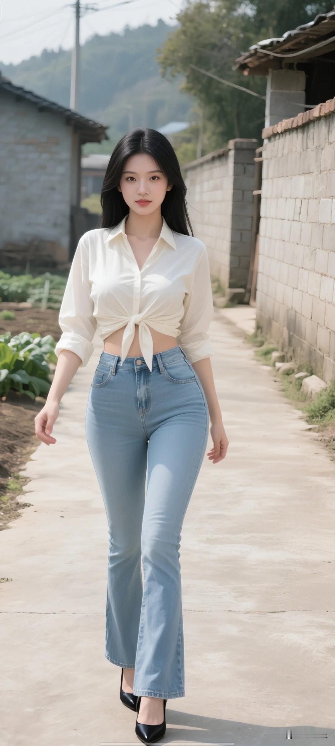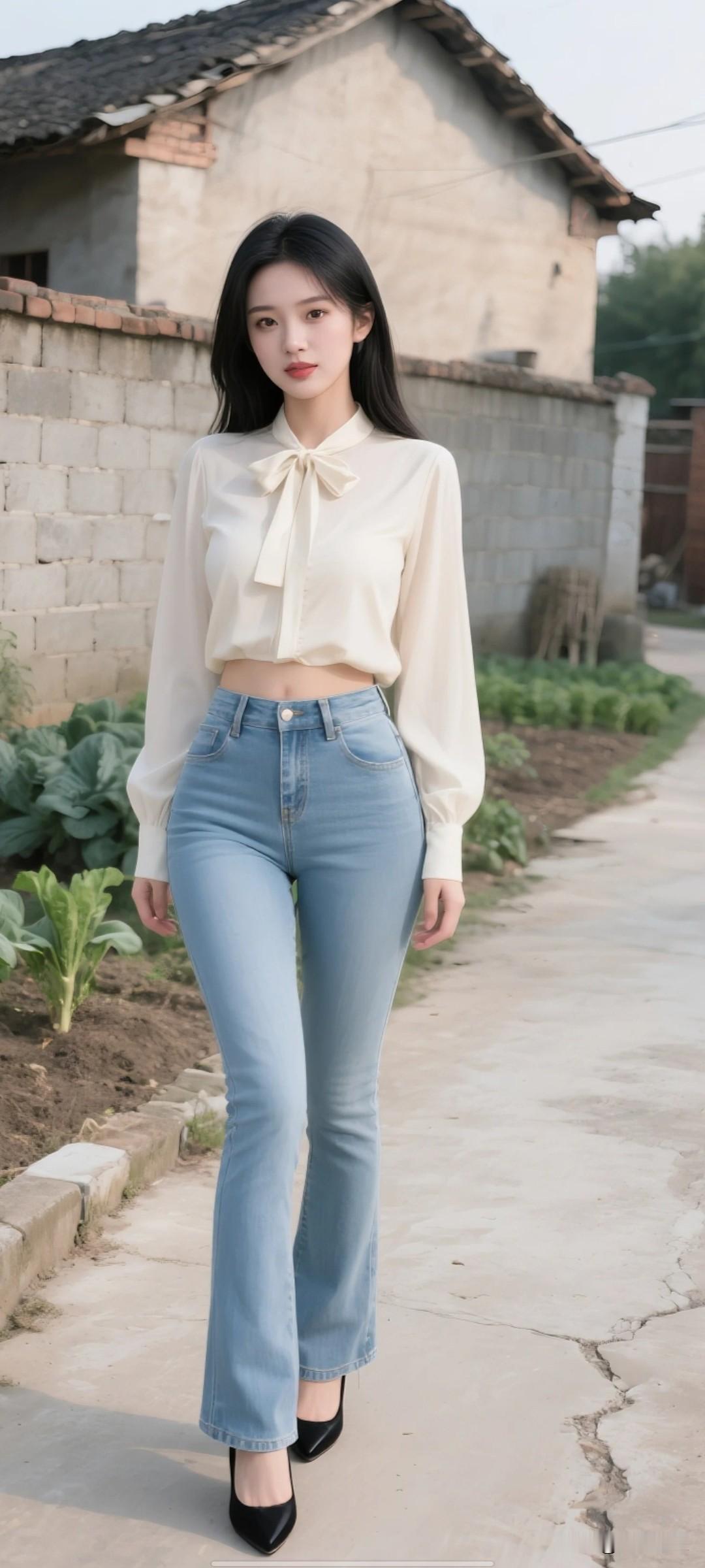 记录生活的最美的瞬间正面照,网红美女,皮肤白皙,肤色均匀自然,纯欲风,黑色发丝清晰可见,纯欲风,对着镜头站在农村老家的水泥路上,动作很随意,有菜地,水泥砖围墙,真实场景,一件米白色的系带衬衫,领口的蝴蝶结设计很精致,浅蓝色紧身牛仔喇叭裤,黑色高跟鞋,葫芦形S身材,网红氛围光,日常快照风格,非精心构图,非专业打光。32K超清画质,细节真实。