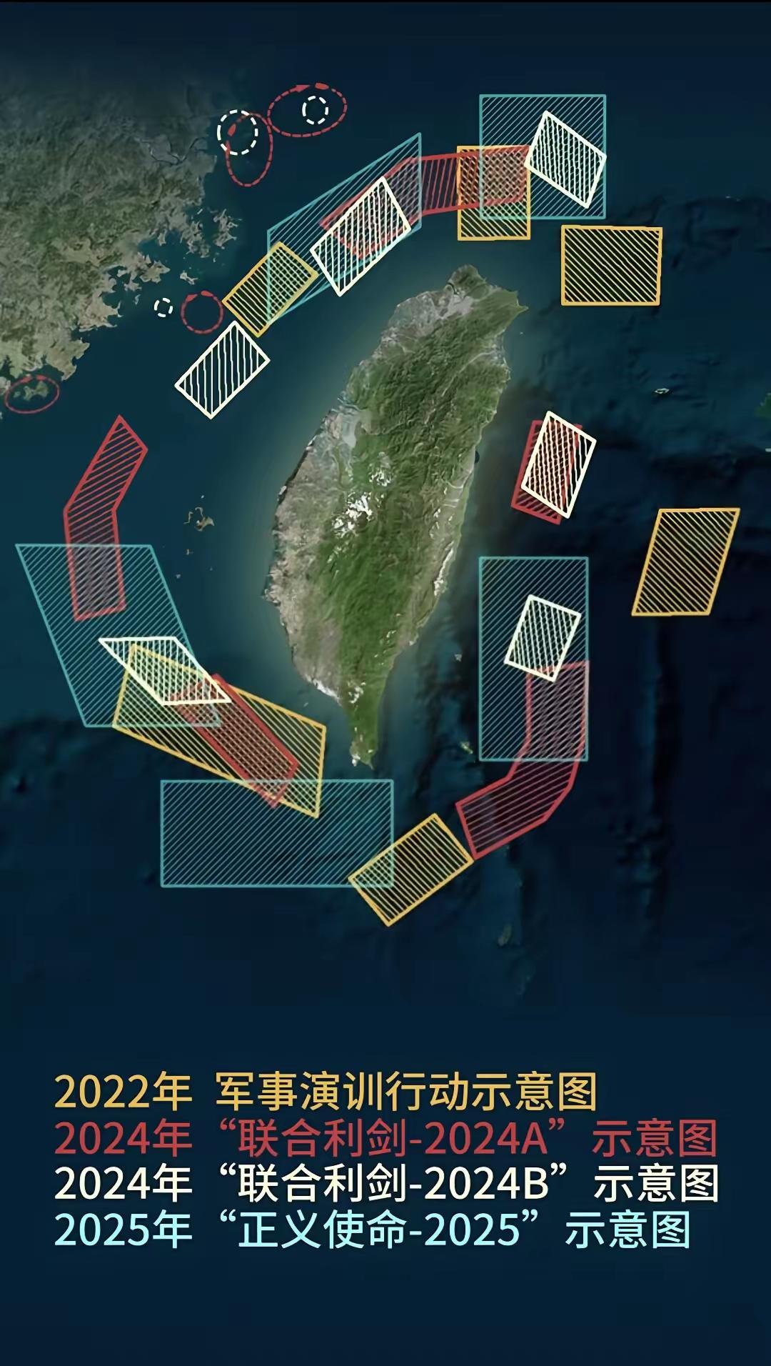 这次的对比图来了!真的是“越来越紧”。 今年上半年的海峡雷霆没有公布区域图,但2022年的军演、2024年的两次利剑行动都公布了。 这次的正义使命也及时公布了区域图,一对比,就可以发现,离台岛更近了! 尤其是南部和东南部,显著比上次更近。 更重要的是,南部军演区域离鹅銮鼻只有不到5海里!东南部只有10海里!所谓的12海里完全被打破了。以后进12海里会常态化了!