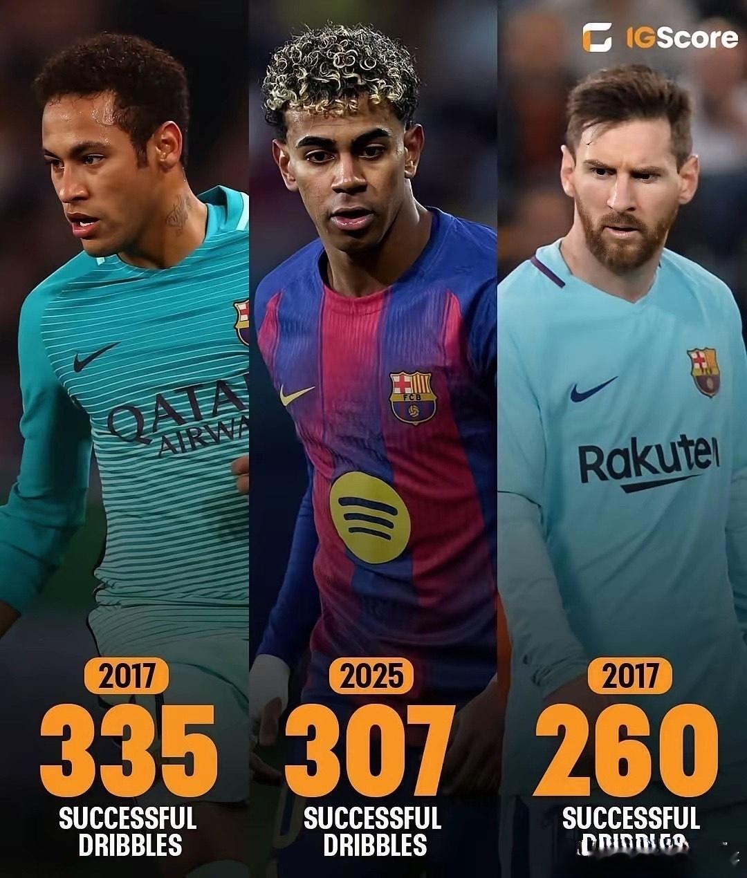 亚马尔与内马尔并列成为仅有的两位在一个自然年里成功过人次数达到300+的球员,强如梅西(260次)也没能做到这一点。足球亚马尔内马尔梅西
